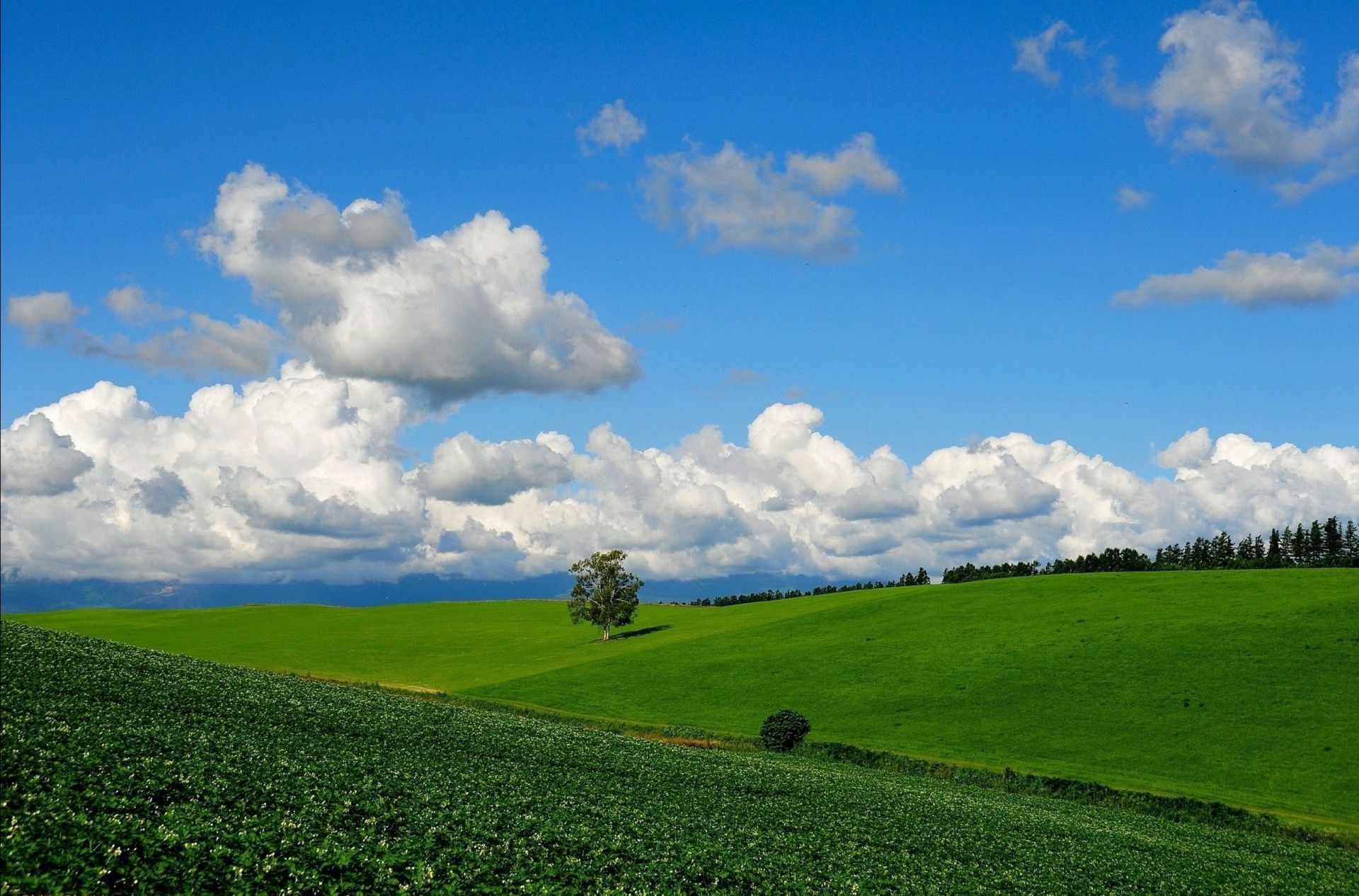 Campo estivo verde e bianco come la neve nuvole sul cielo blu