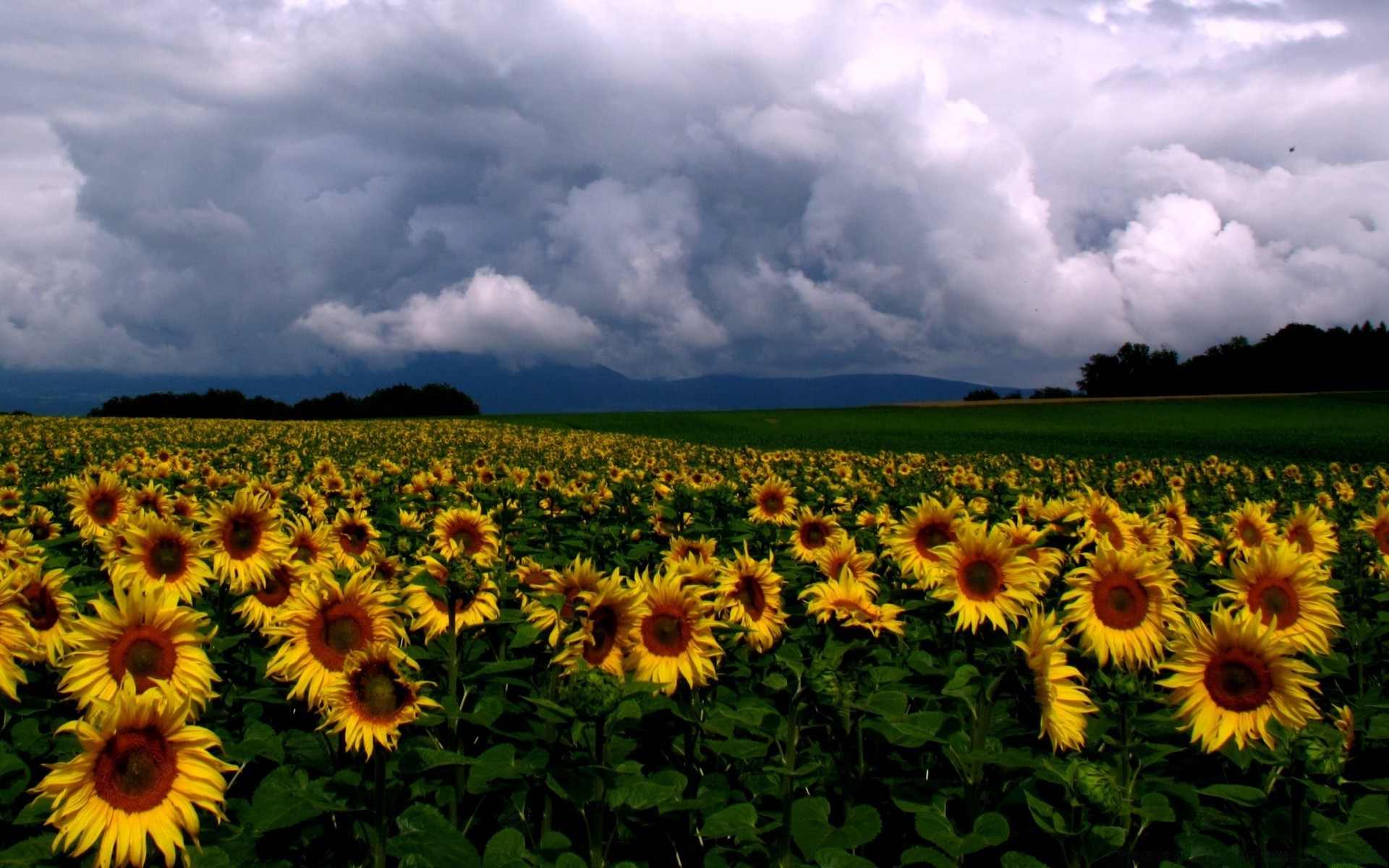 Campo di girasoli su uno sfondo di cielo con nuvoleCampo di girasoli su uno sfondo di cielo con nuvole