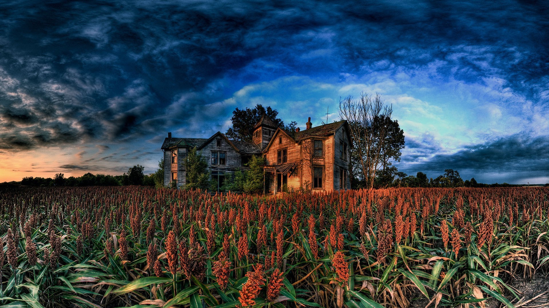 Vecchio Ranch in un campo di mais prima di un temporale. Cielo scuro