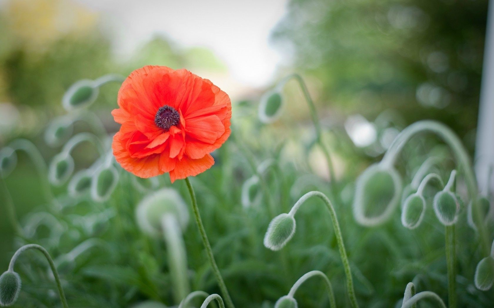 Fiore arancione brillante su uno sfondo di fiori non sbocciati
