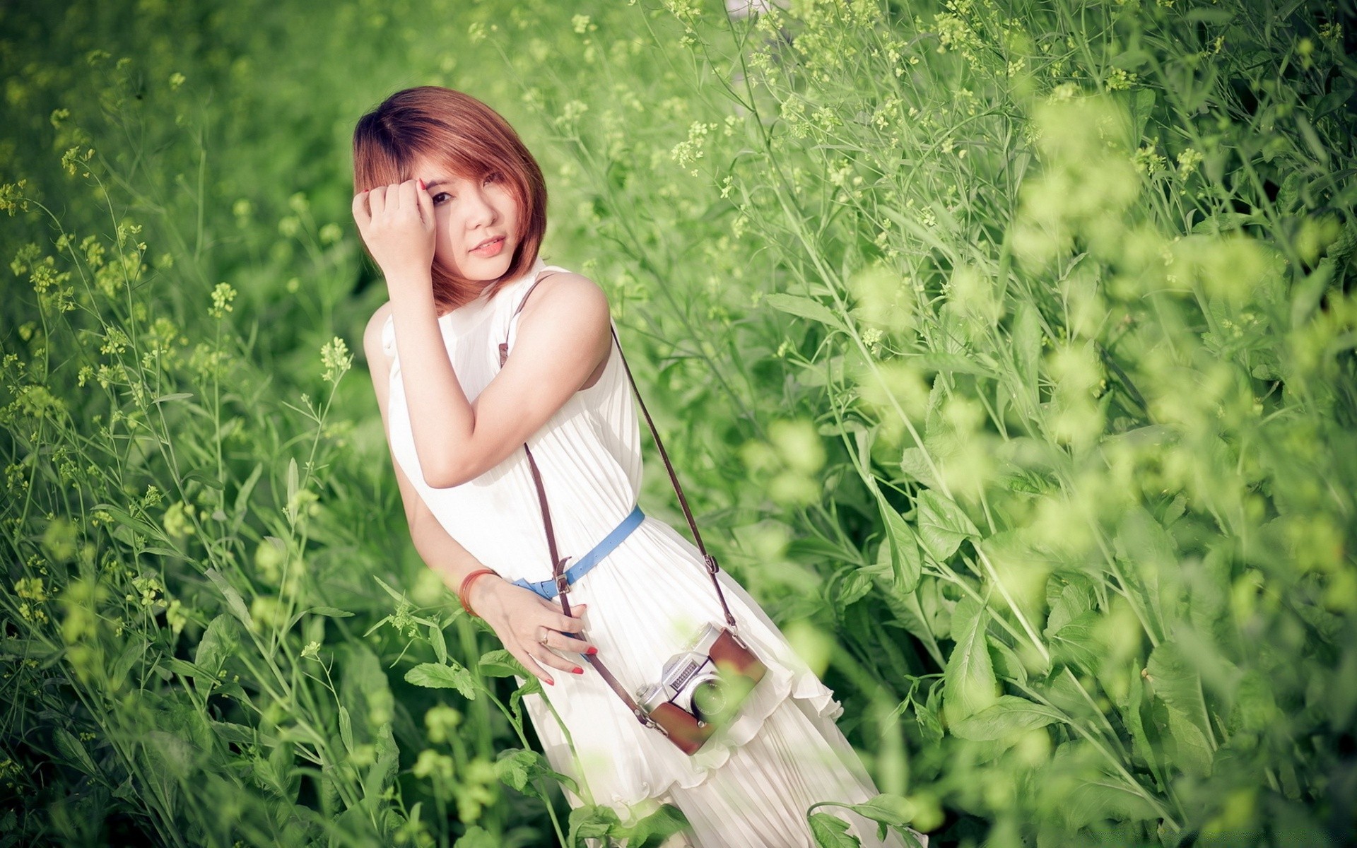 Ragazza nel campo nell'erba con la macchina fotografica