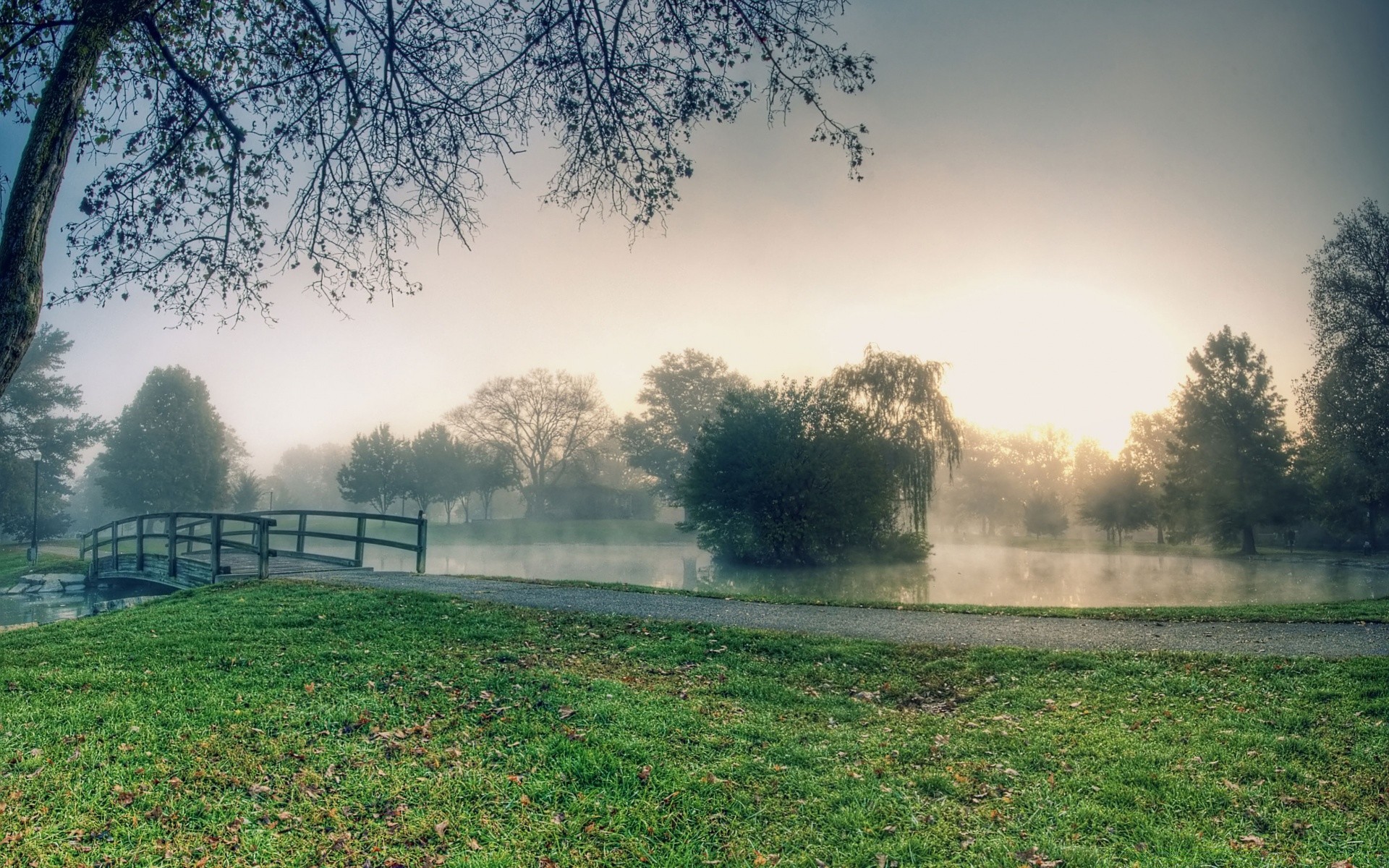 Paesaggio nebbia sopra il lago sentiero lungo il lago