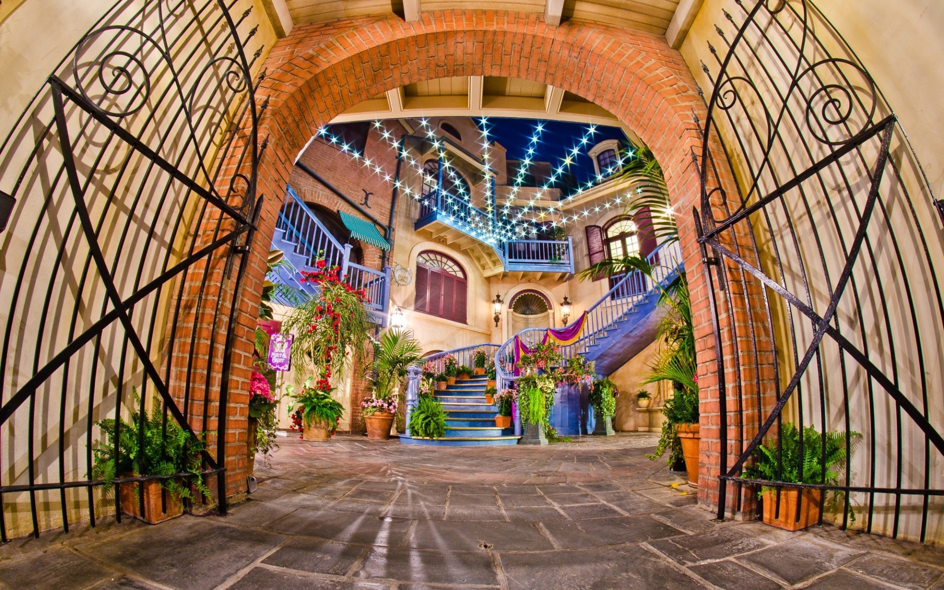 Accogliente patio luminoso dietro un cancello aperto