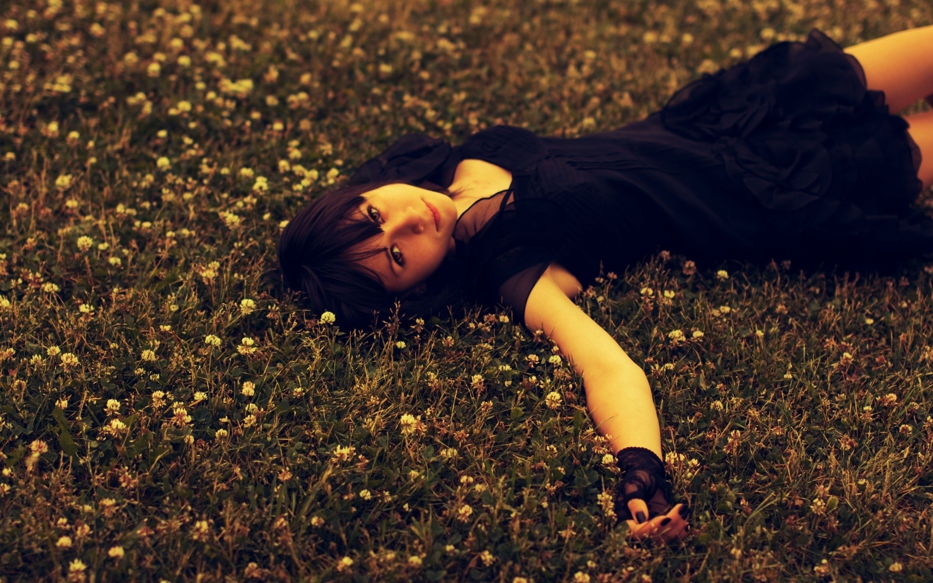 Ragazza in nero si trova sul prato inglese