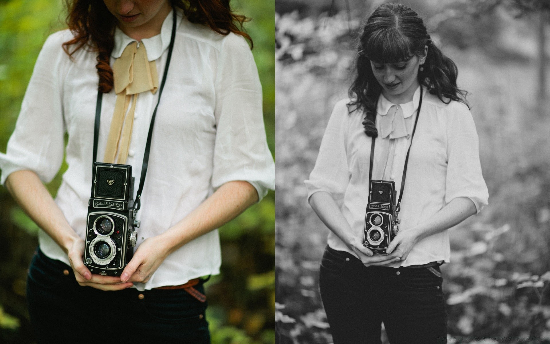 Donna con una macchina fotografica in foto a colori e in bianco e nero