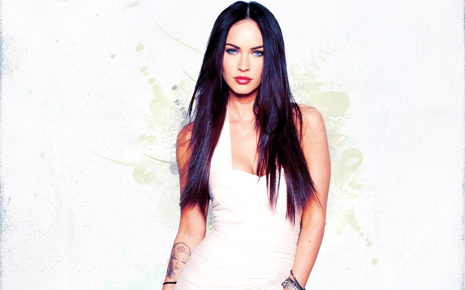 Ragazza dai capelli scuri in abito bianco. Megan Fox