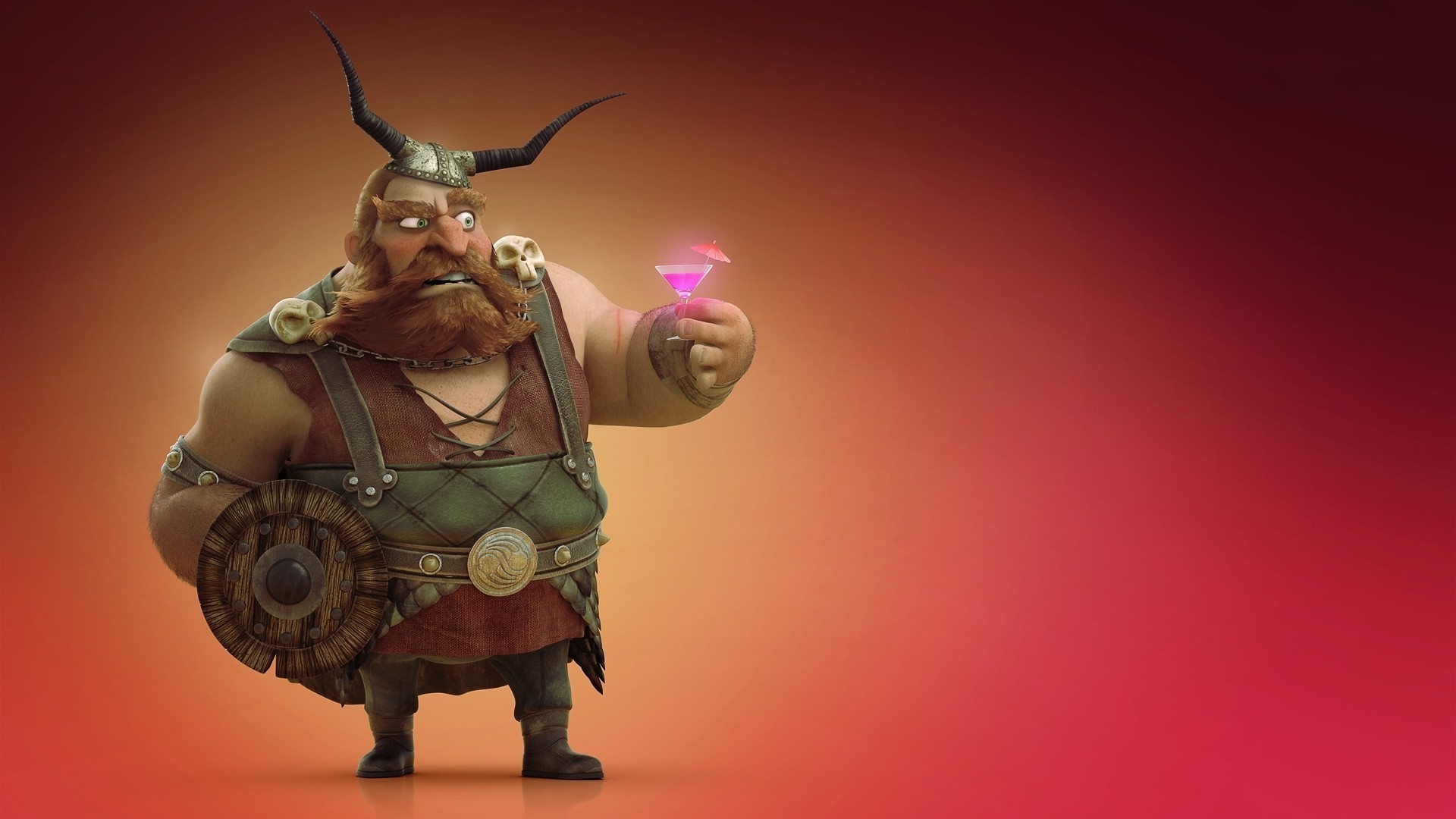Il vichingo dei cartoni animati con le corna esamina il bicchiere con la bevandaIl vichingo dei cartoni animati con le corna esamina il bicchiere con la bevanda