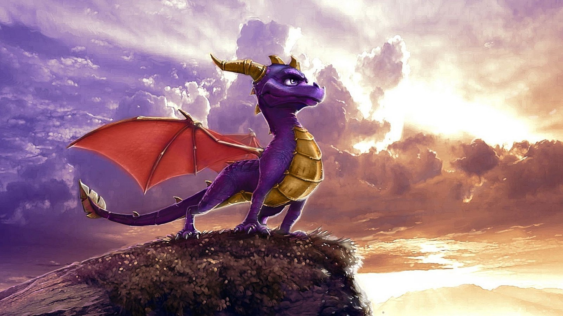 Piccolo drago alato e cornuto multicolore in piedi con orgoglio su una scogliera di montagna