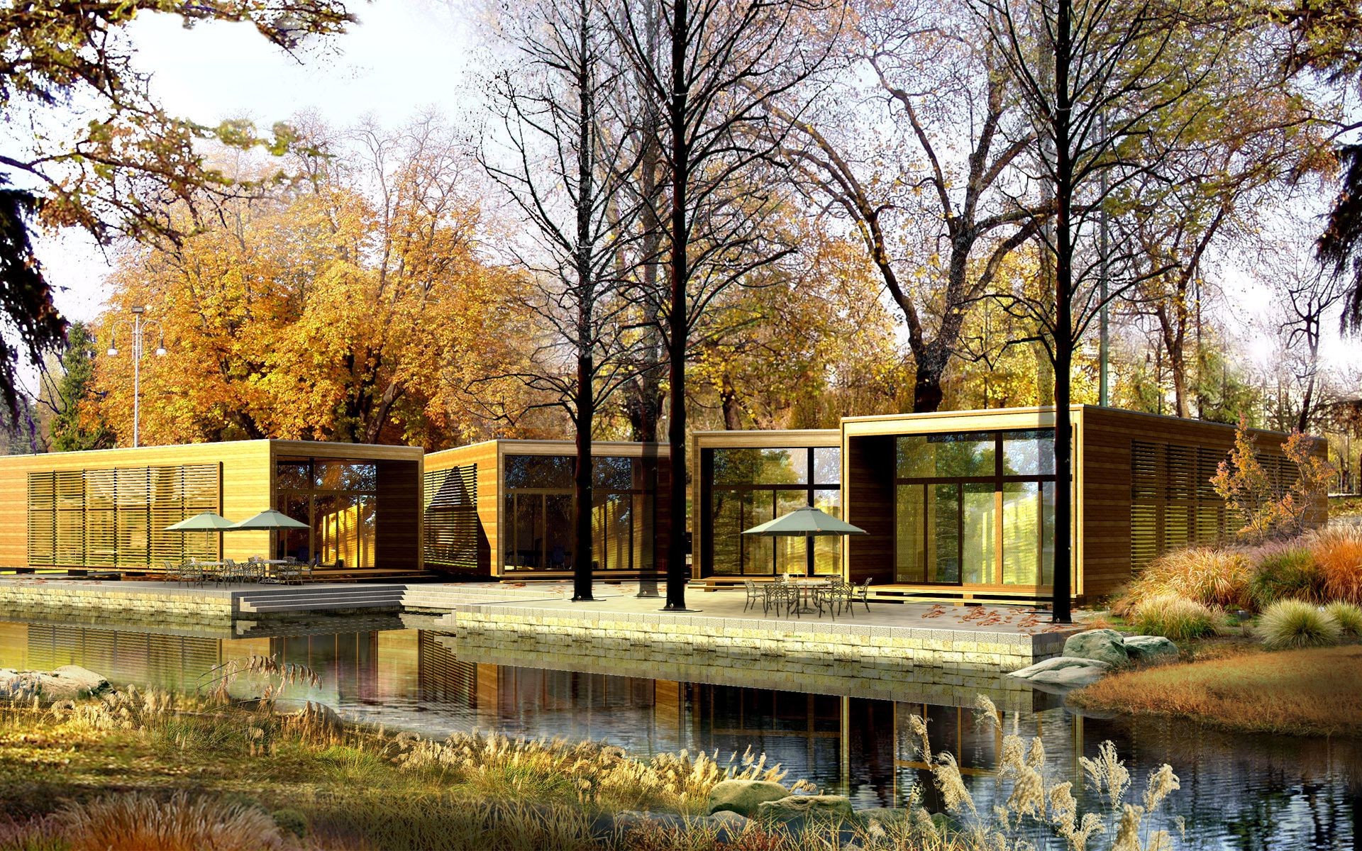 Bella casa vetrata a un piano sul fiume