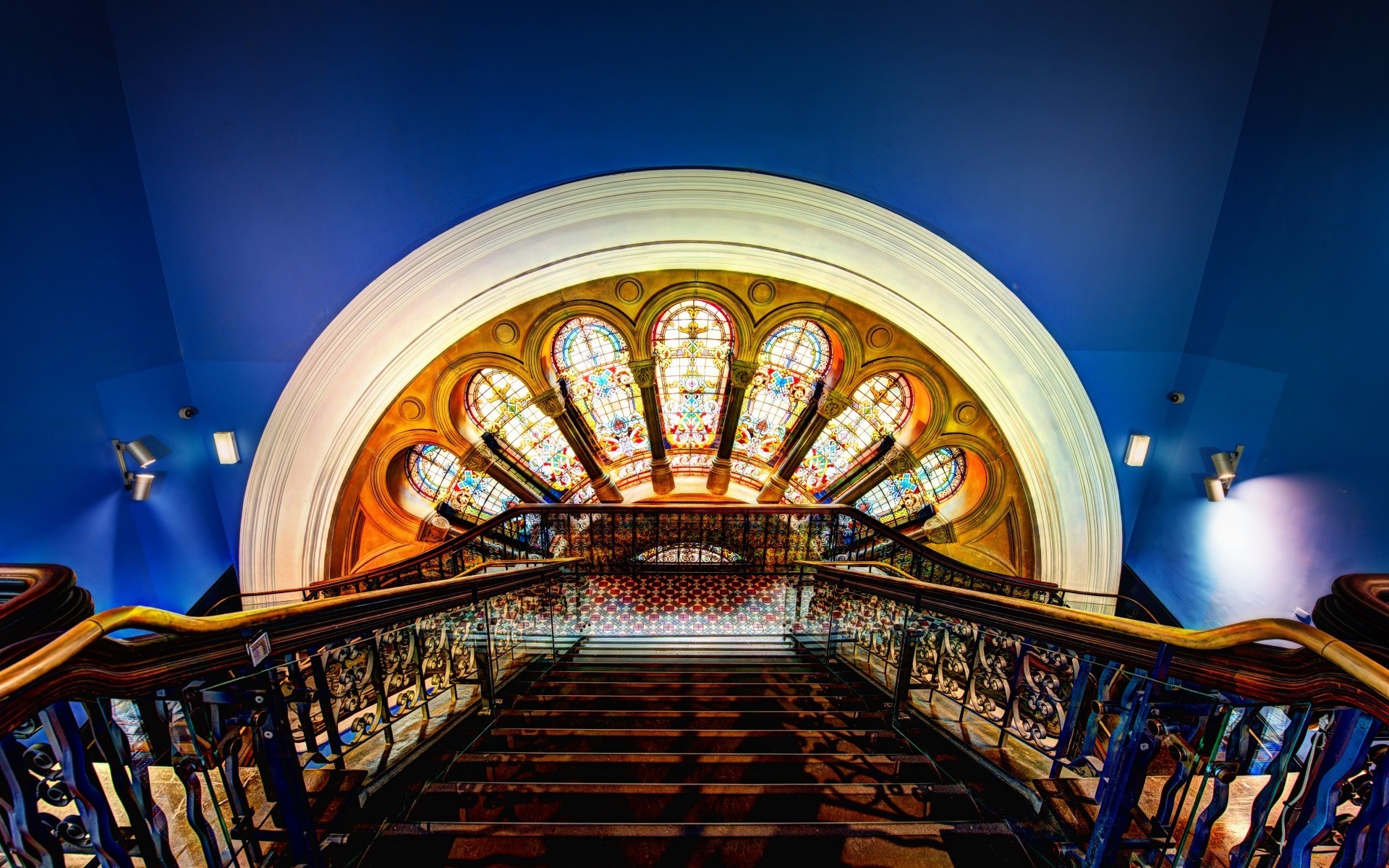 Finestra interna in vetro colorato con scala