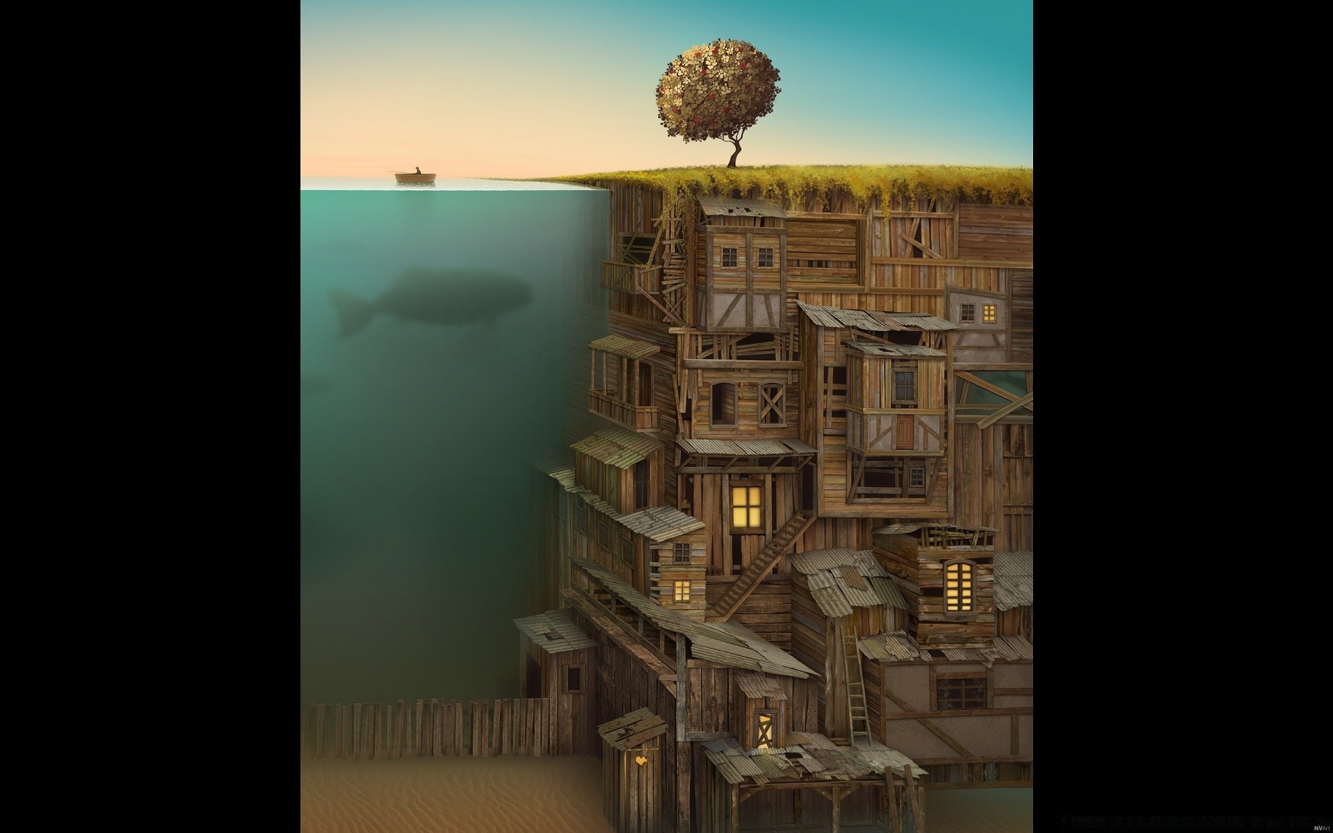 Casa in stile fantasy con finestre illuminate in piedi vicino all'acqua