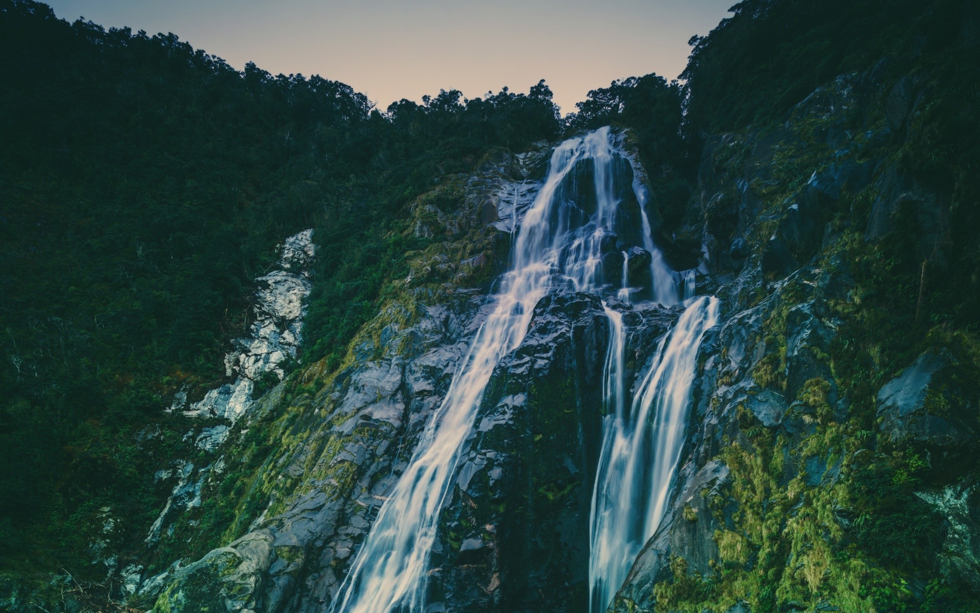 Sottili getti di cascata lavano gli alberi sul fianco della montagnaSottili getti di cascata lavano gli alberi sul fianco della montagna