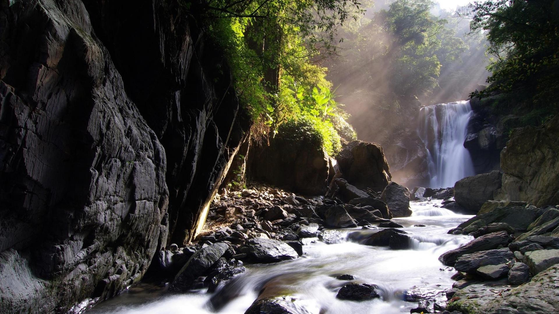 La cascata sfocia nel fiume sullo sfondo degli alberi autunnali