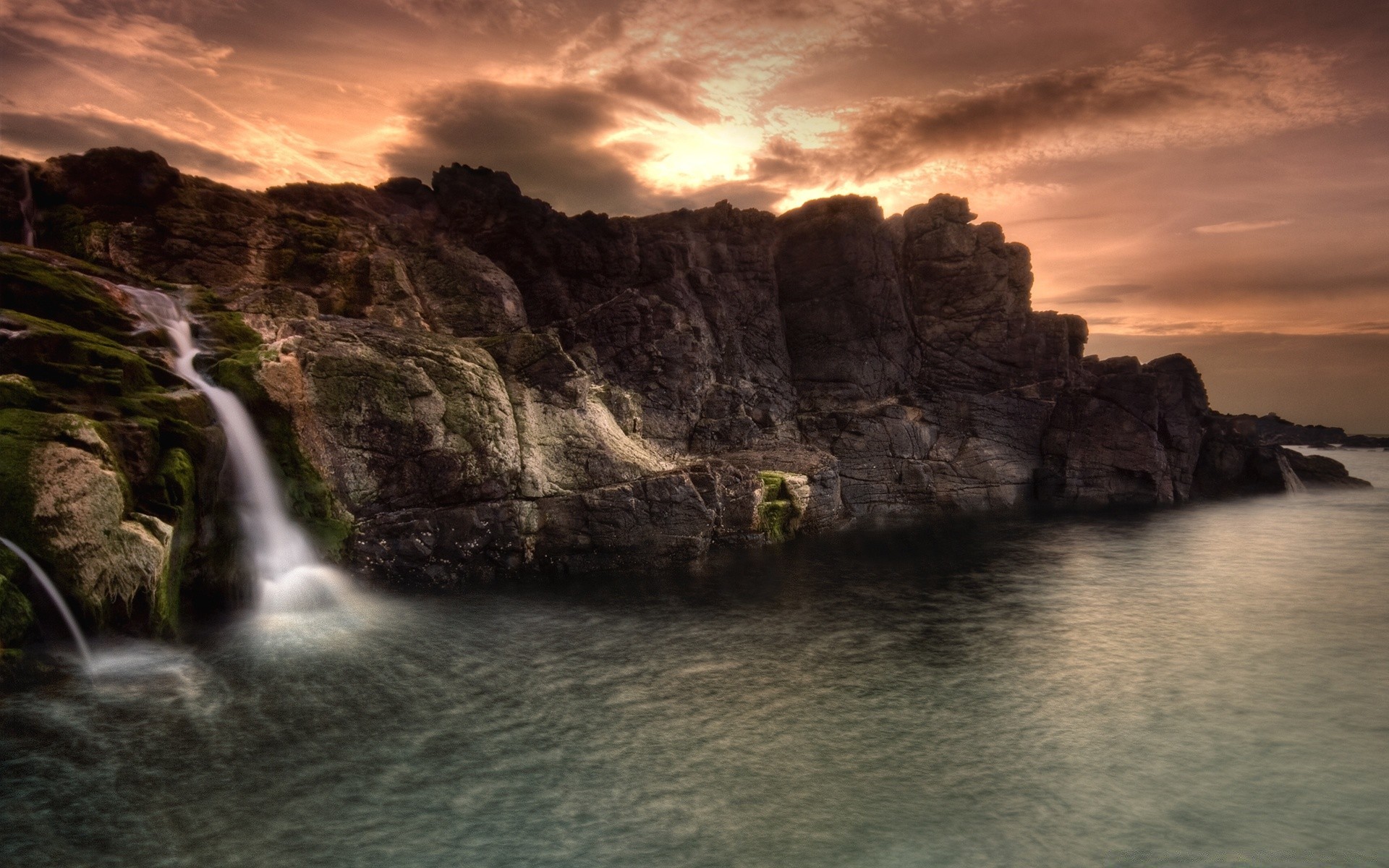 Cascata sullo sfondo di un bellissimo tramonto