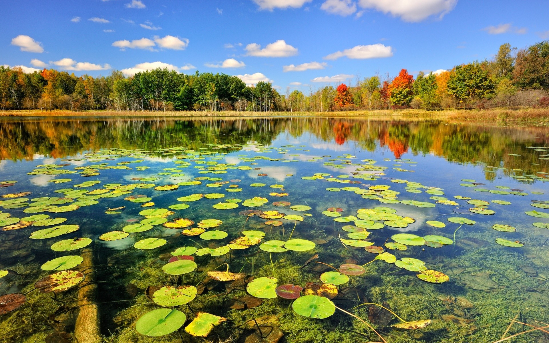 Lago con la fermentazione della foresta autunnale