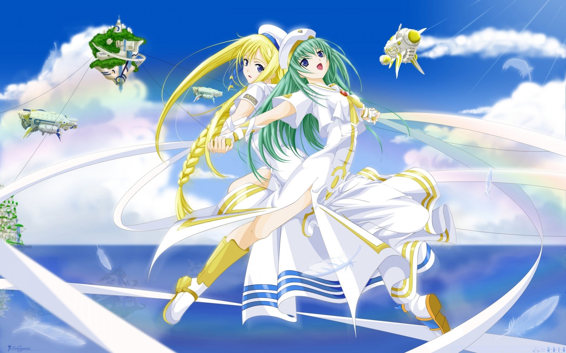 Due eroine anime in abiti bianchi che fluttuano nell'aria sopra la superficie del mareDue eroine anime in abiti bianchi che fluttuano nell'aria sopra la superficie del mare