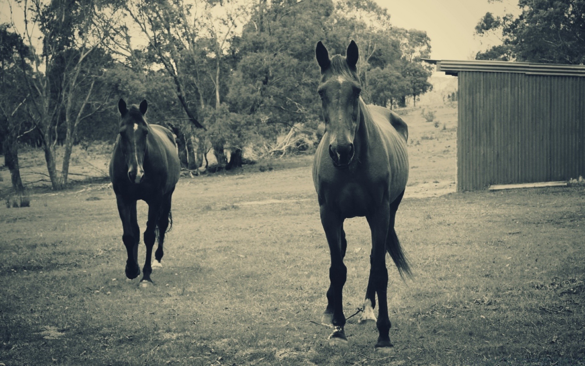 Una coppia di cavalli corre attraverso il campo al tramonto