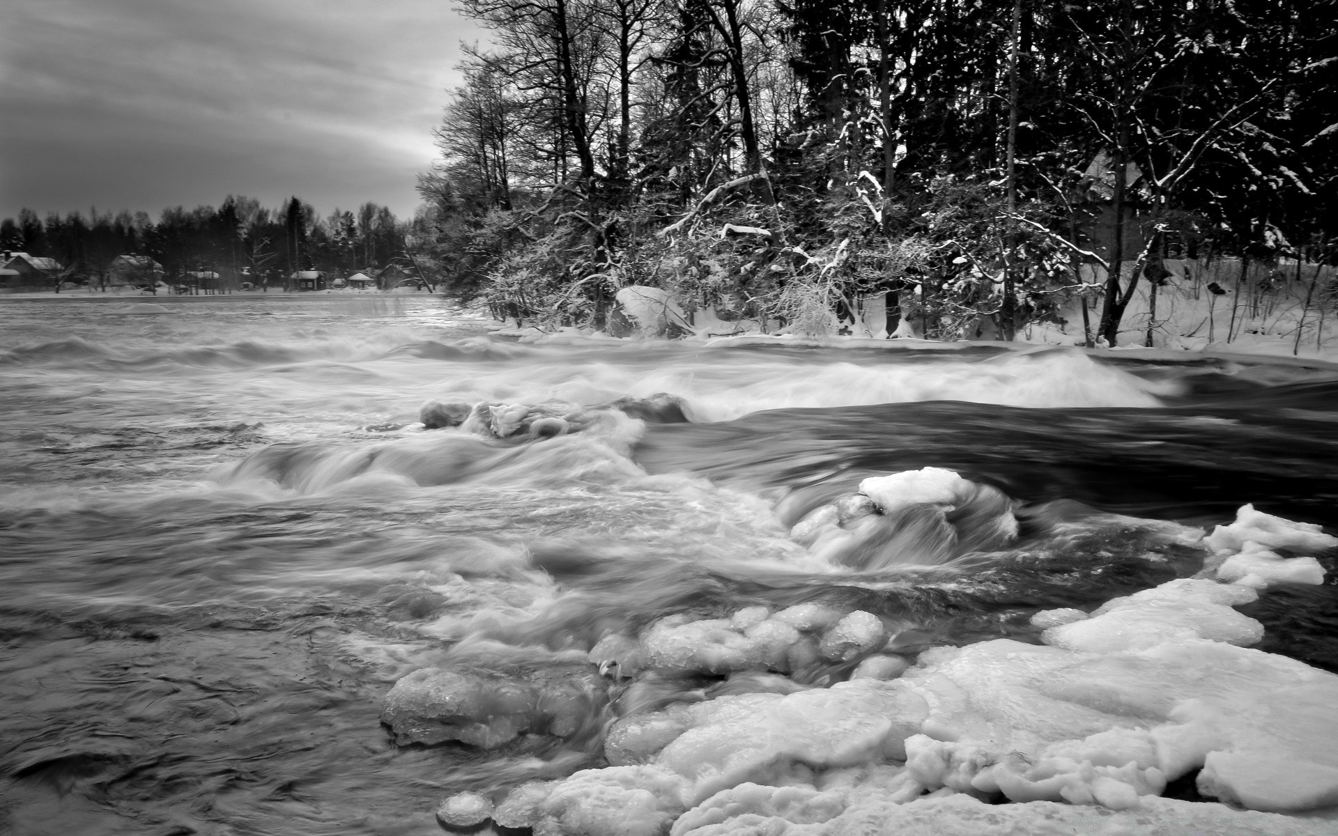Fotografia in bianco e nero del flusso del fiume in inverno