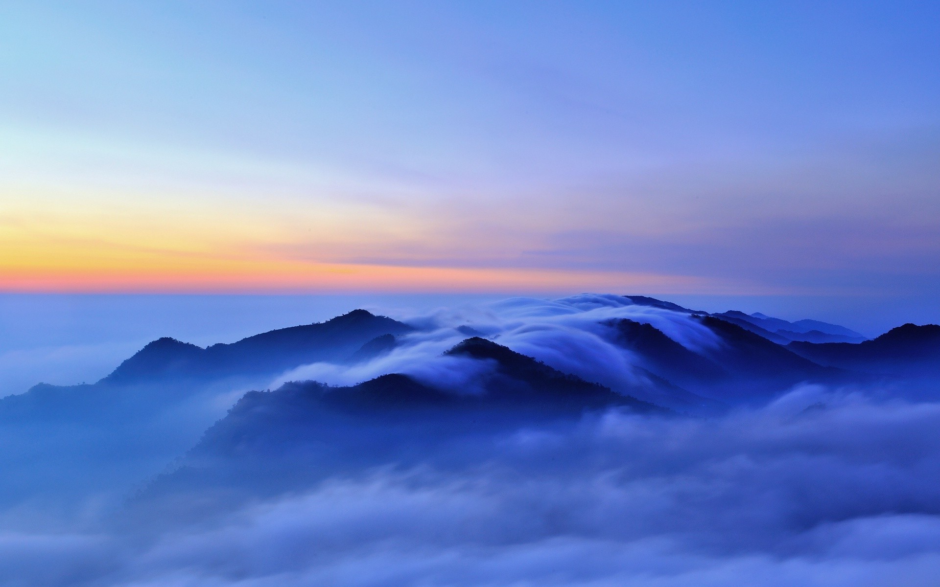 Cime di montagna tra le nuvole al tramonto
