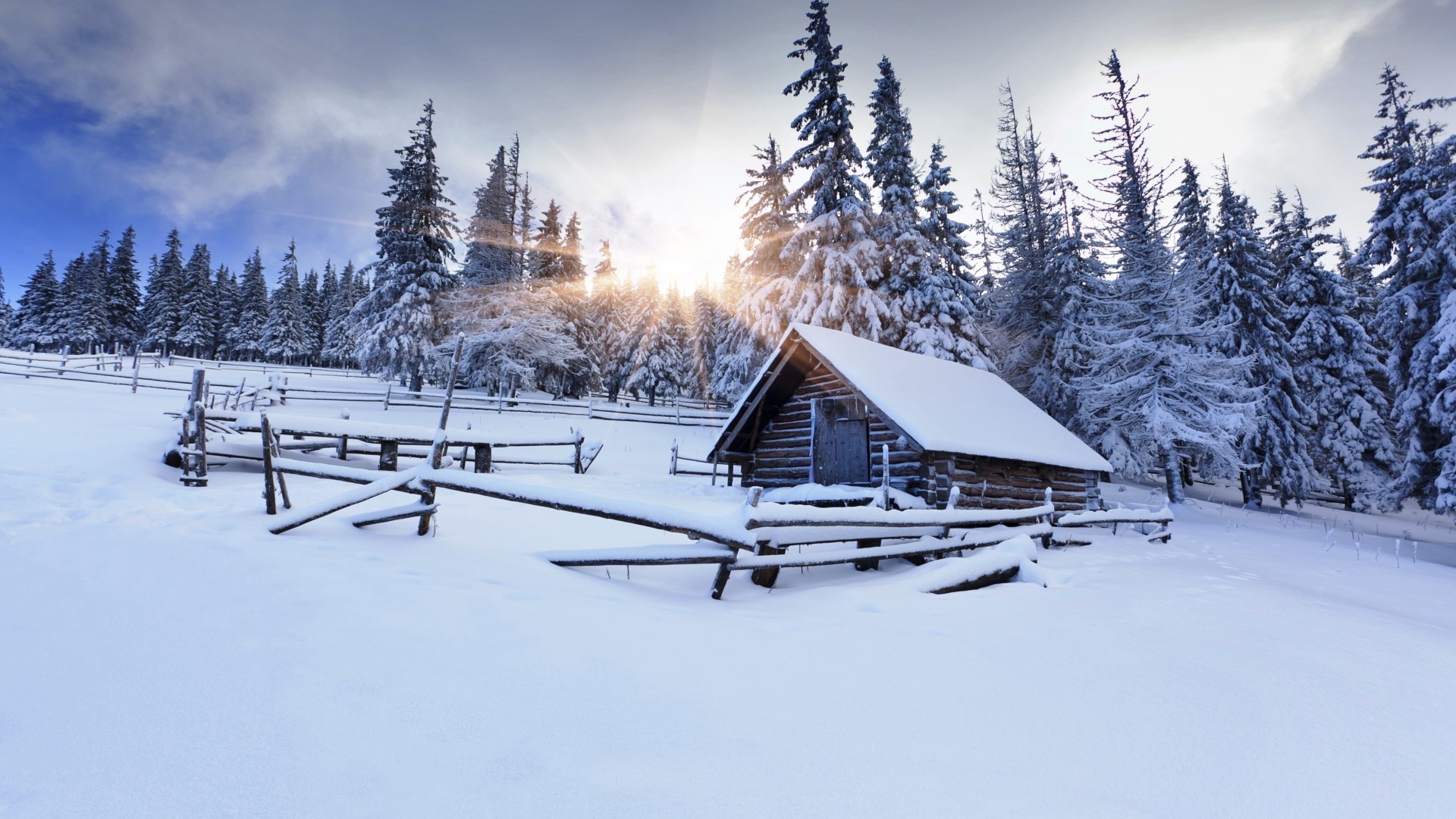 Capanna nella foresta invernale sullo sfondo delle montagne