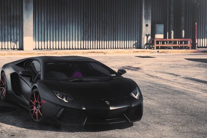 Auto sportiva nera parcheggiata fuori dal garage