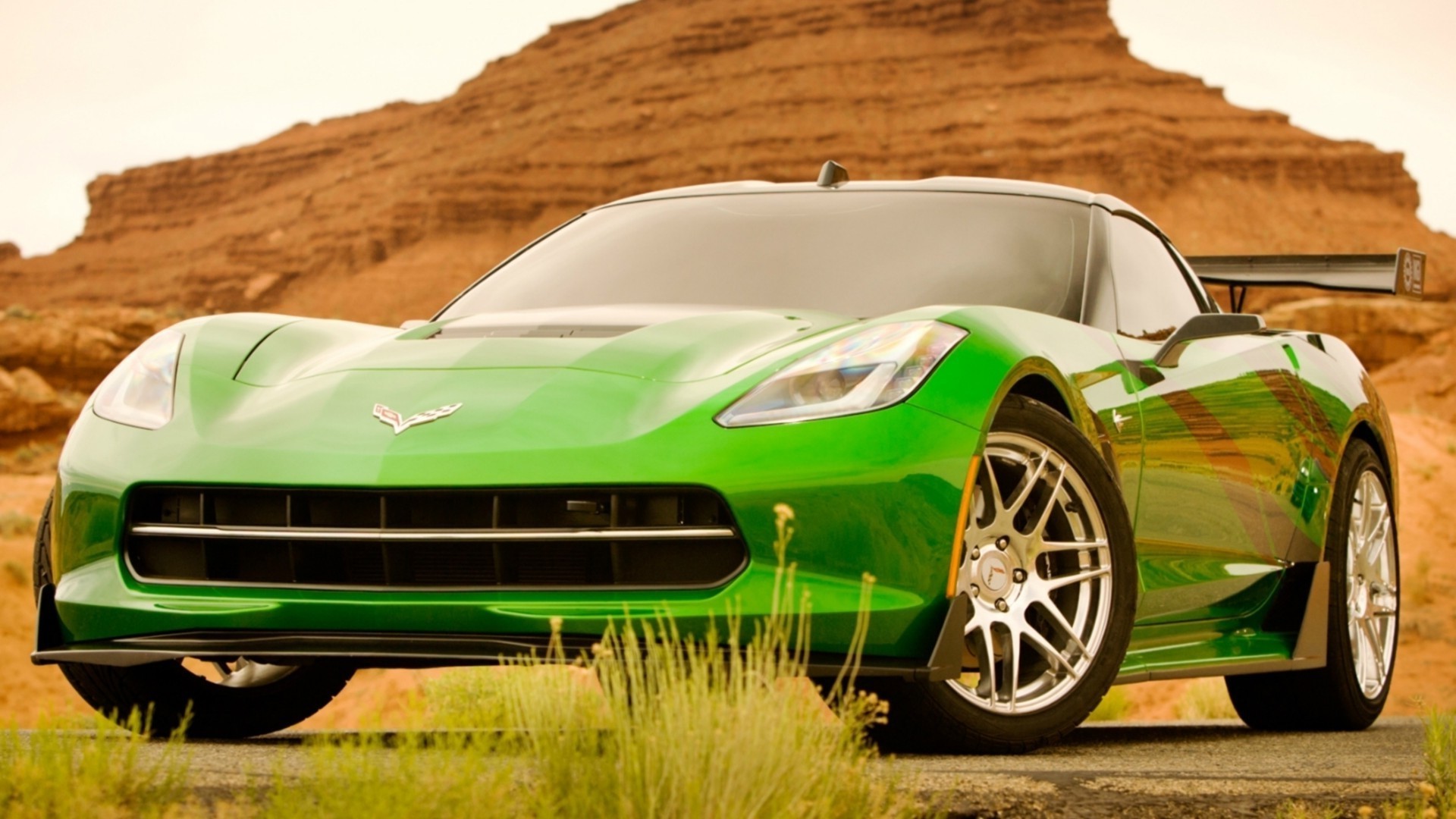 Un'auto sportiva argentata si trova sulla strada tra le verdi colline