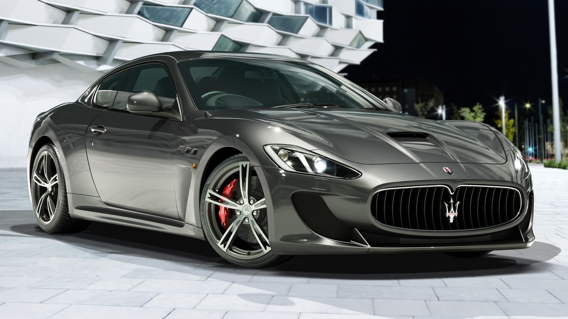 Un'auto sportiva rossa si trova sullo sfondo di una città notturna nelle luci
