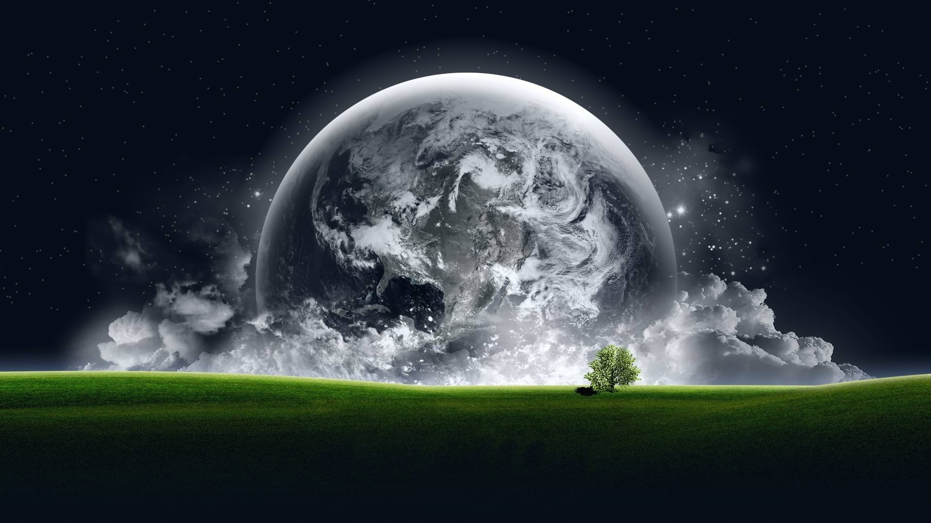Albero solitario sullo sfondo di stelle e Luna
