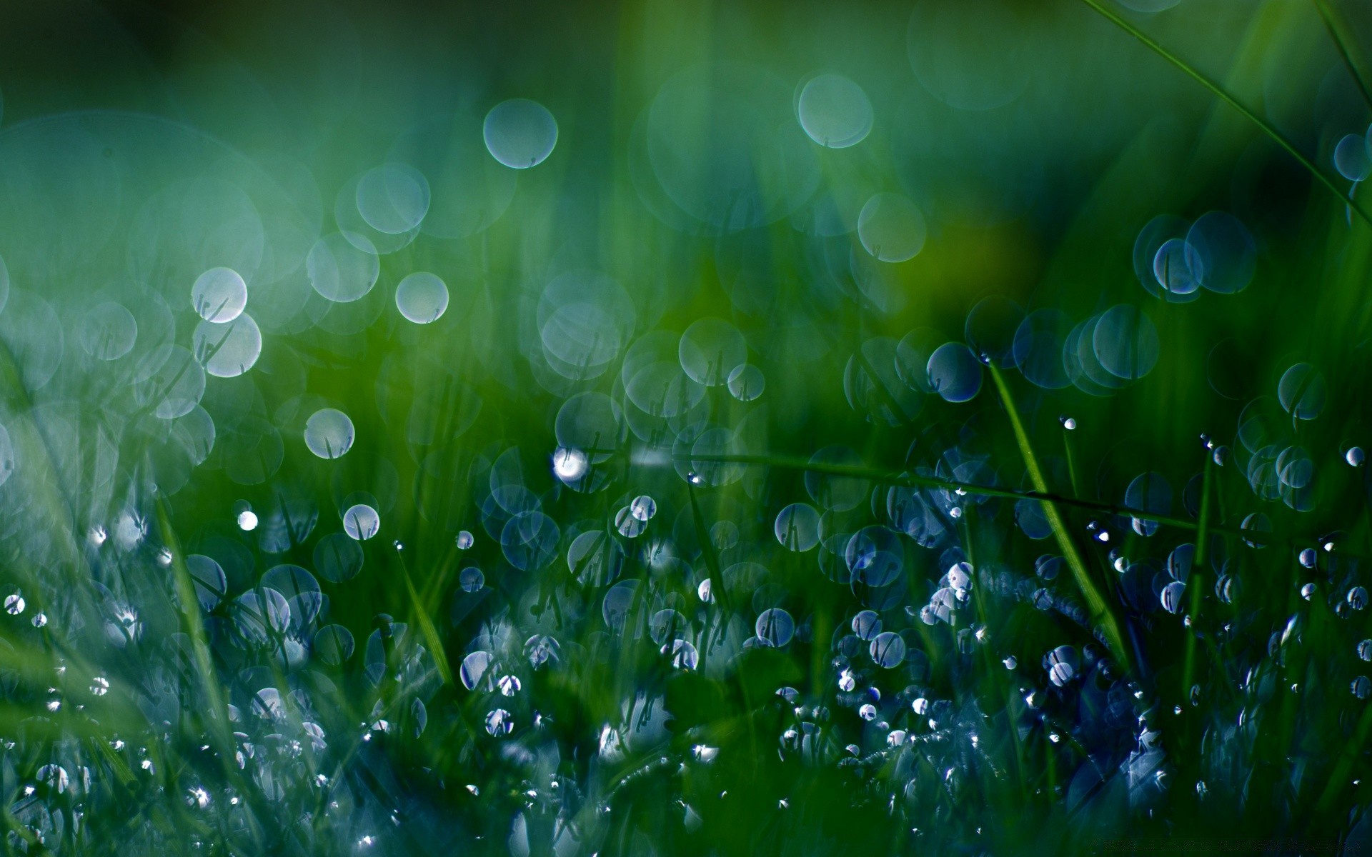 Goccioline di acqua su sfondo verde con i raggi del sole