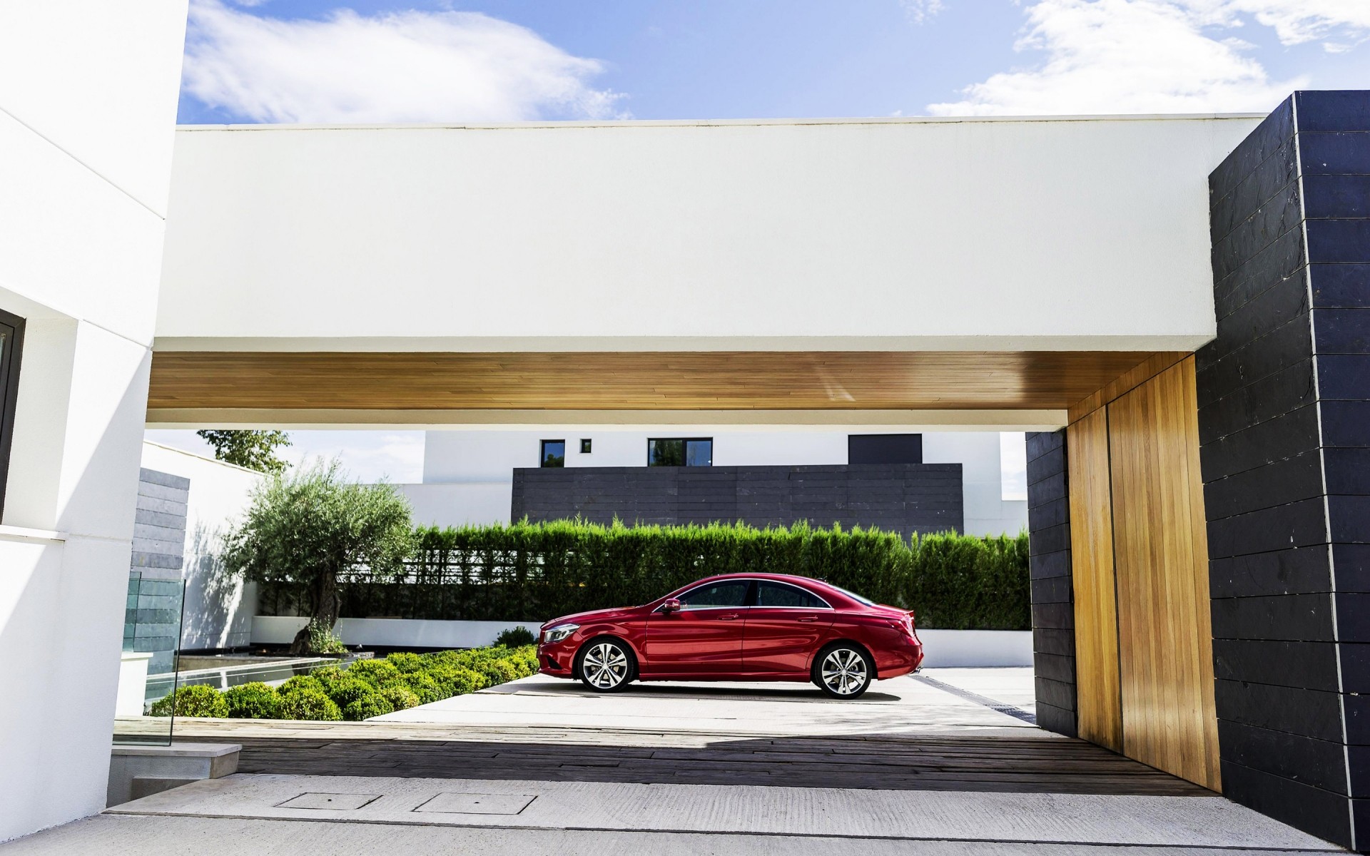 Mercedes Benz rossa su plozadka vicino al cespuglio verde