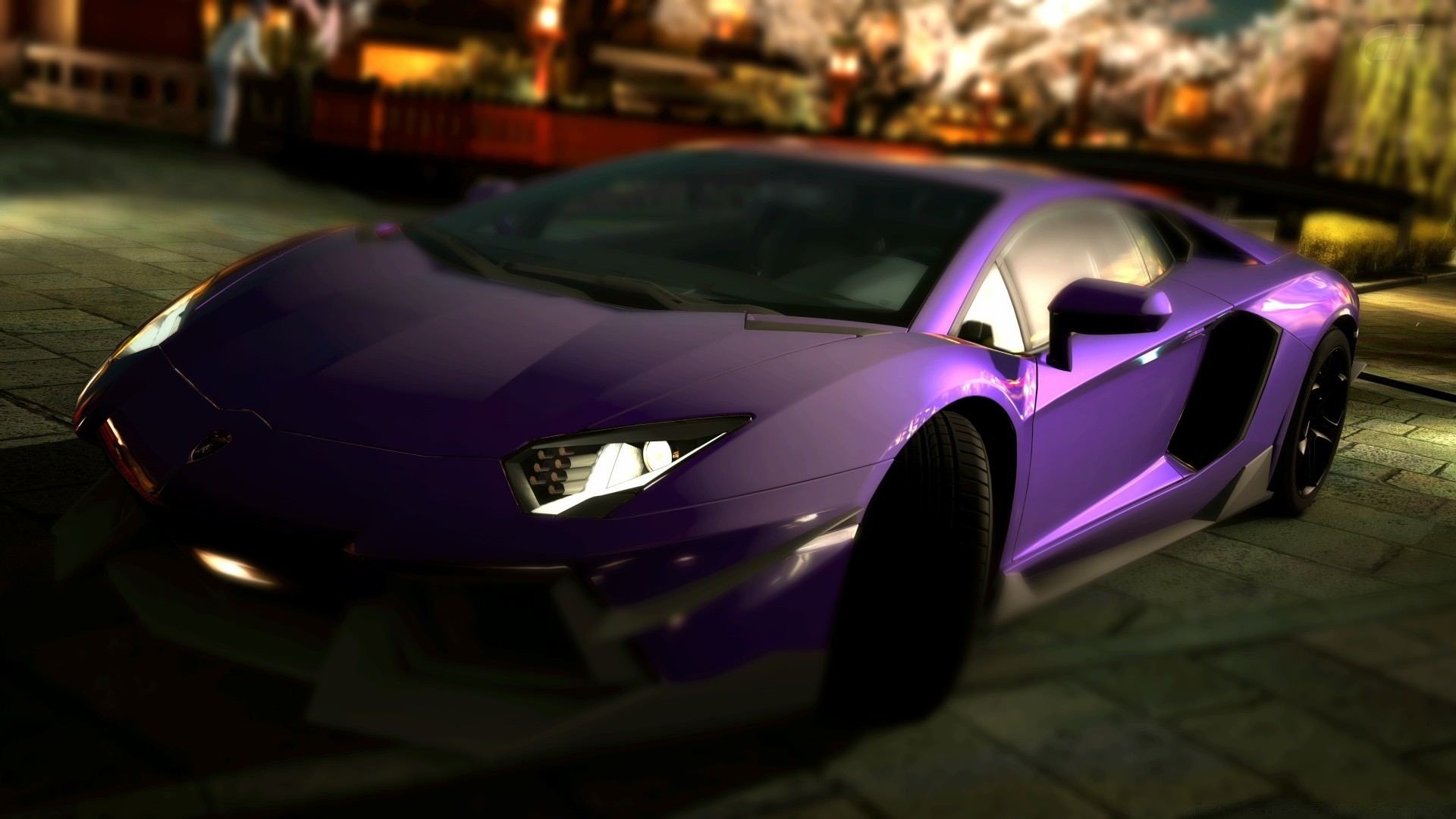 Un'auto sportiva brillante sulla strada vicino a un piccolo edificio