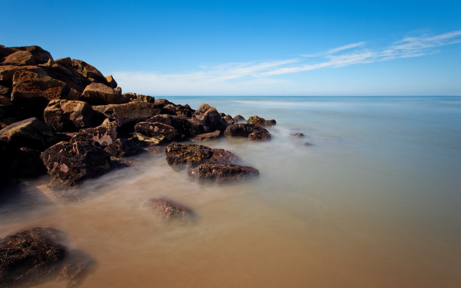 Calma acqua di mare vicino alla costa rocciosa sotto il cielo blu