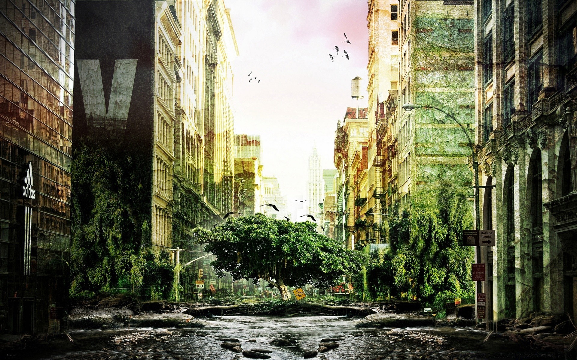 Un albero è cresciuto in mezzo alla strada in una città abbandonata