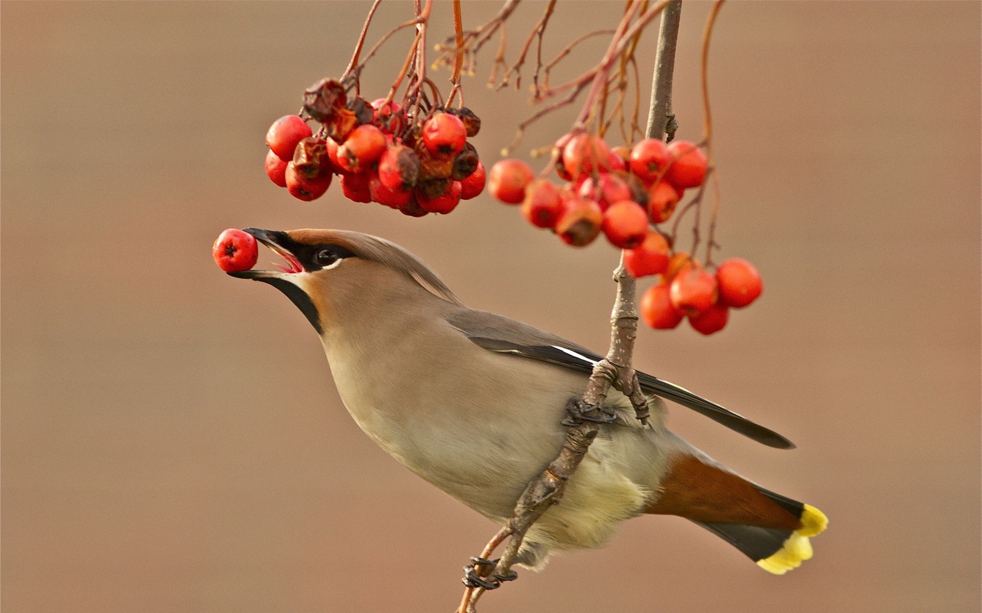 Bacche e uccelli. uccello con un rametto di viburnoBacche e uccelli. Uccello con un rametto di viburno
