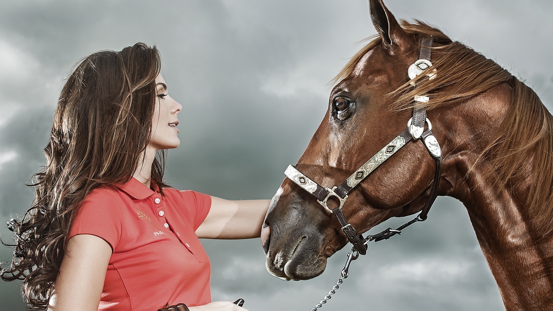 Ritratto di una ragazza con un cavallo su uno sfondo di cielo grigio