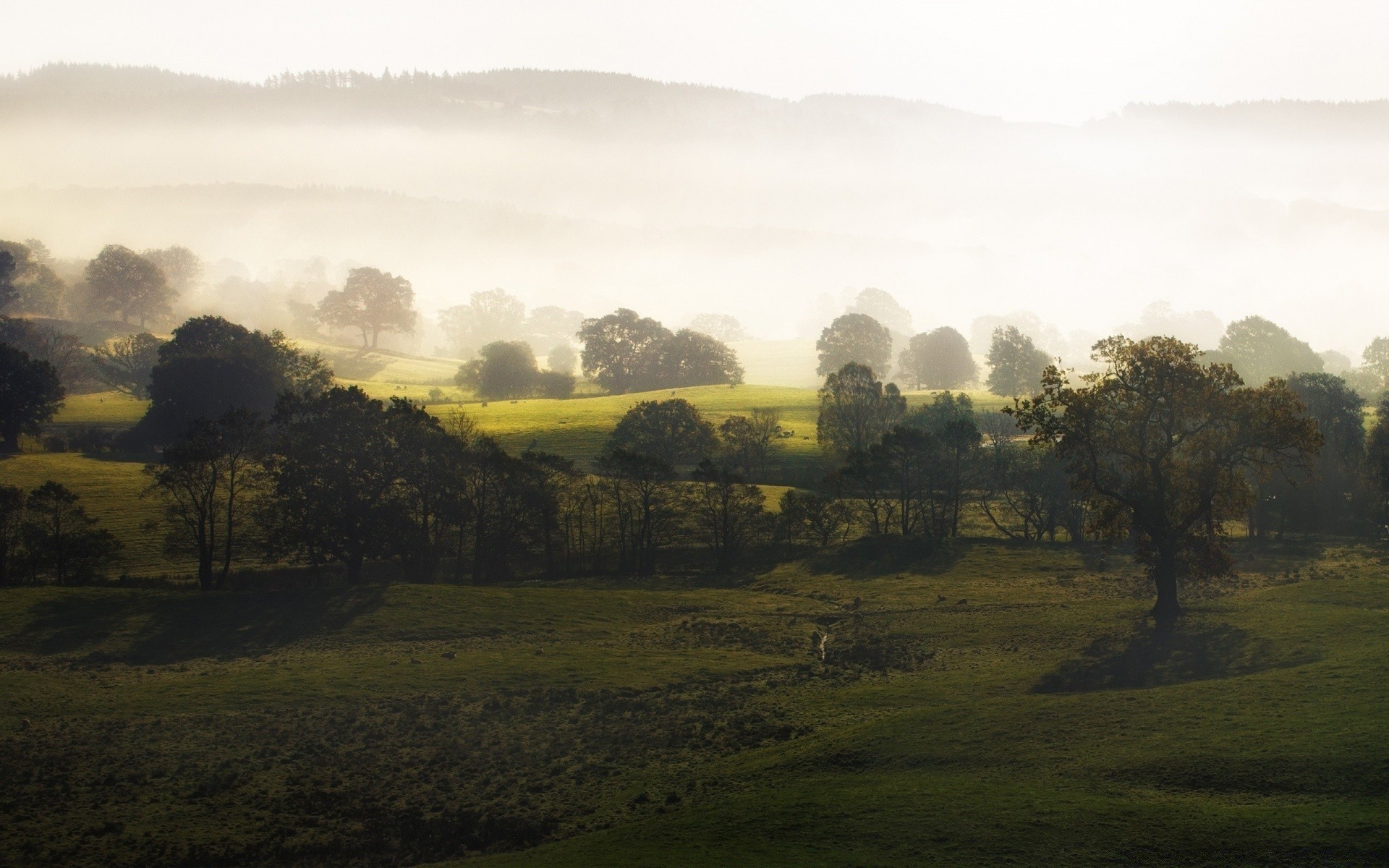 La nebbia copre le colline con gli alberi