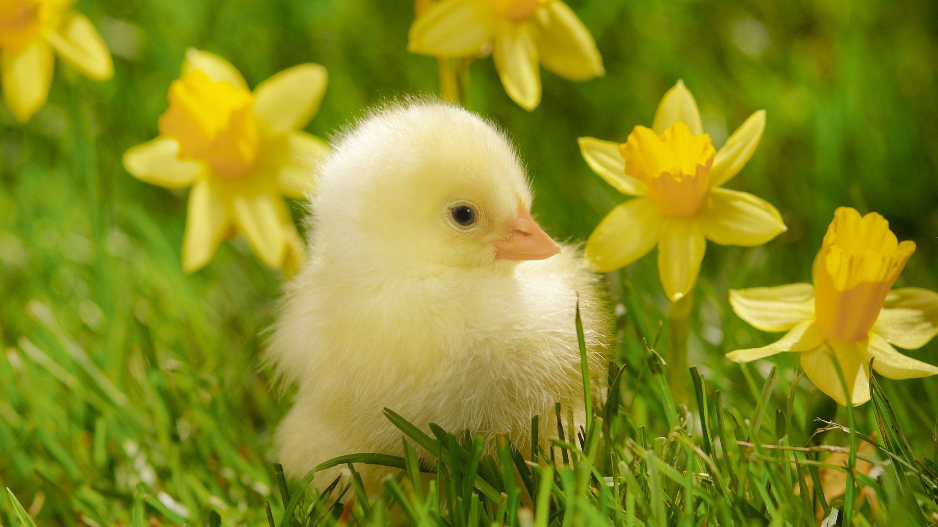 Pulcino sveglio nell'erba con i narcisi