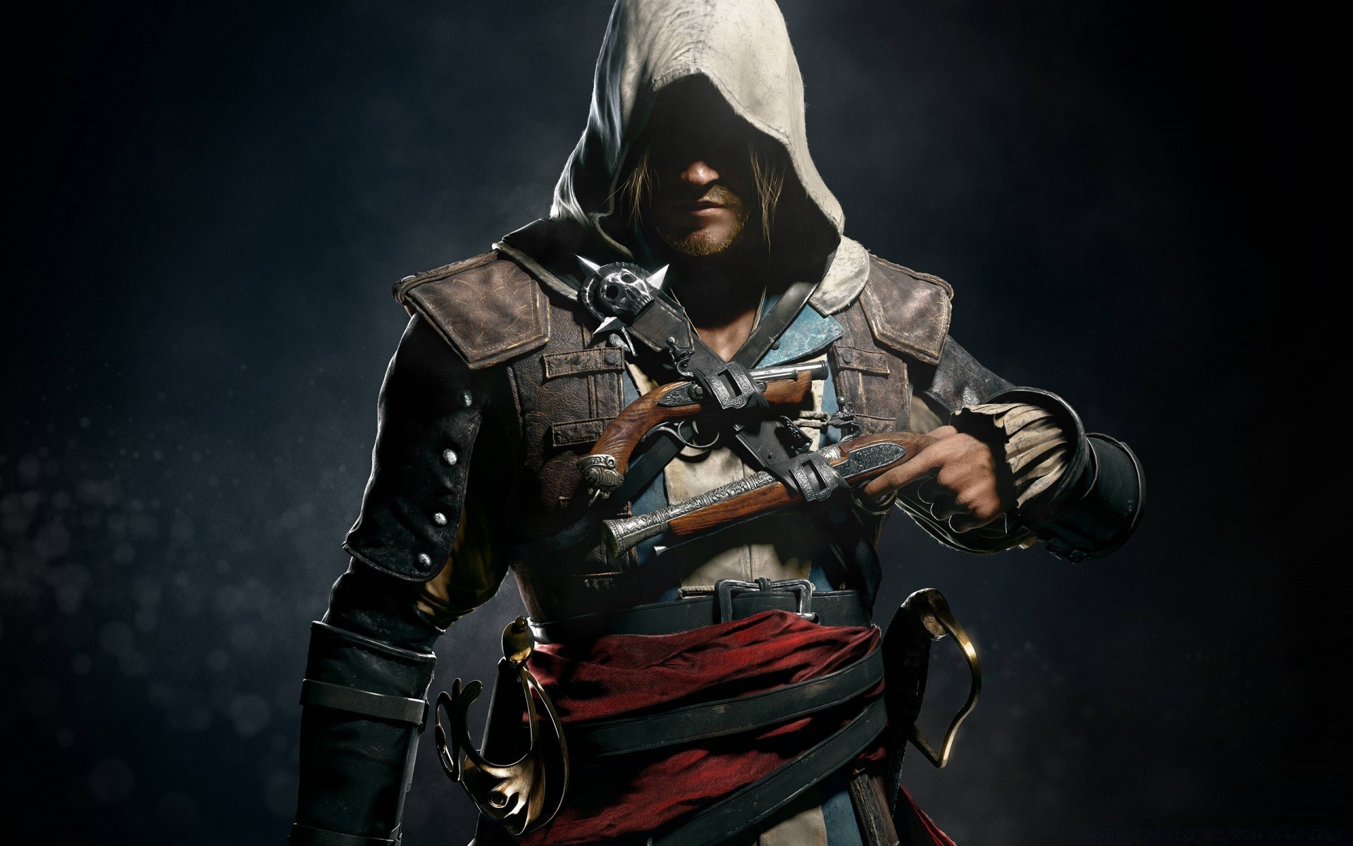 Immagine dal gioco assassin s creed uomo sullo sfondo di una città sfocata