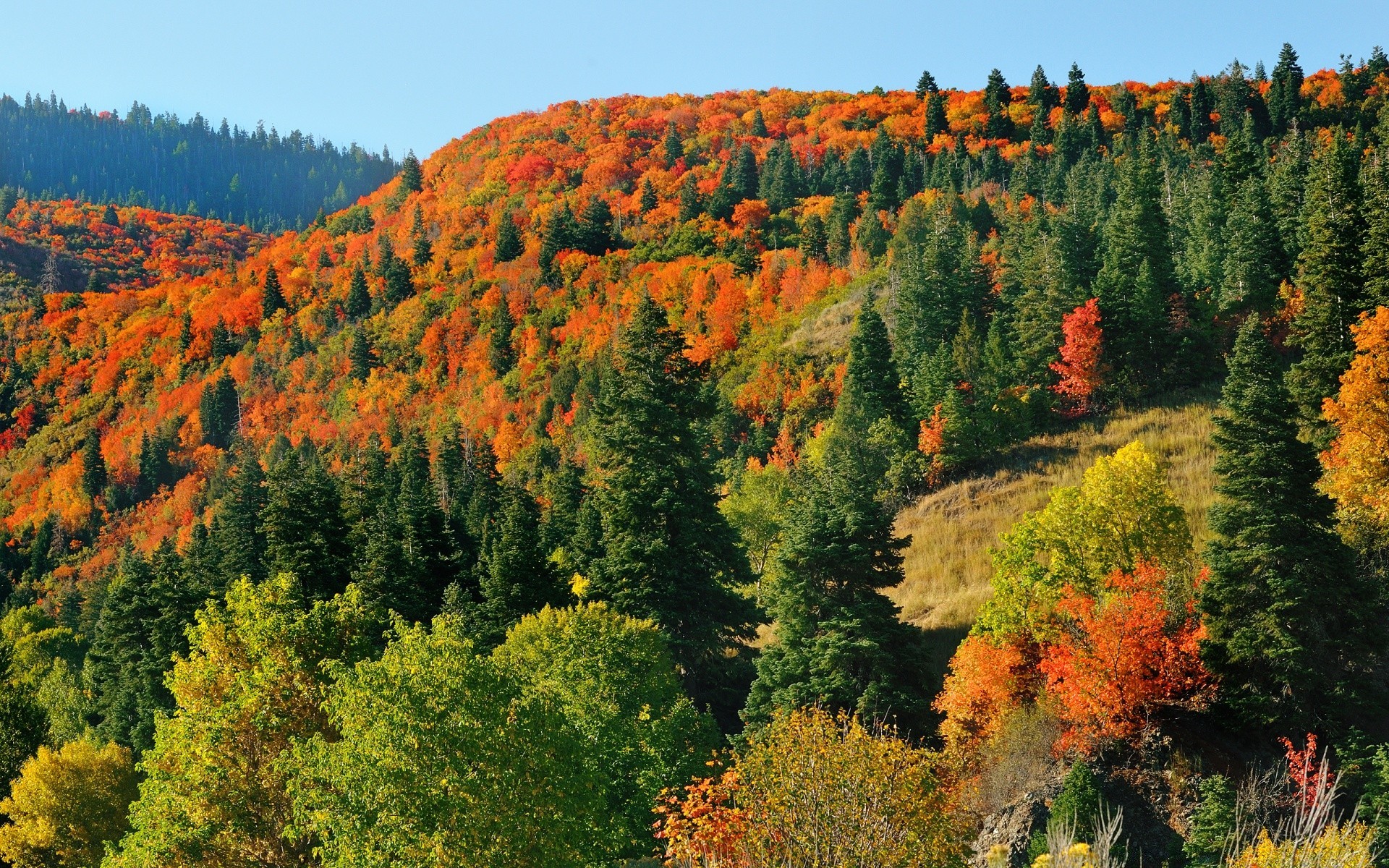 Alberi di natale lussureggianti e cielo blu chiaroAlberi di Natale lussureggianti e cielo blu chiaro