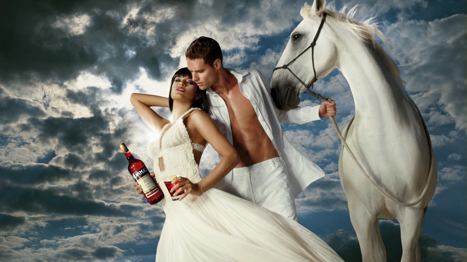 Coppia innamorata sotto un ombrello su sfondo bianco