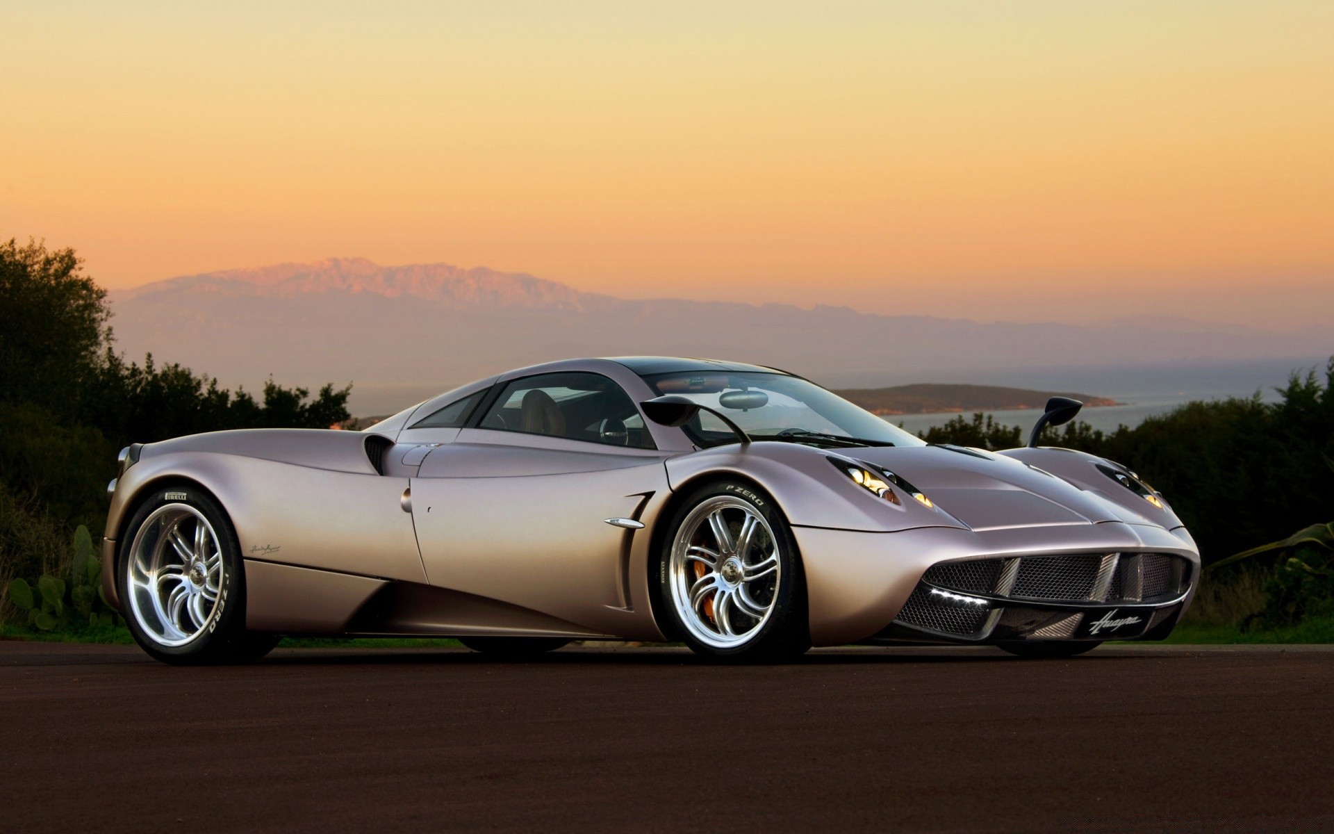 Macchina da corsa d'argento sullo sfondo del tramonto