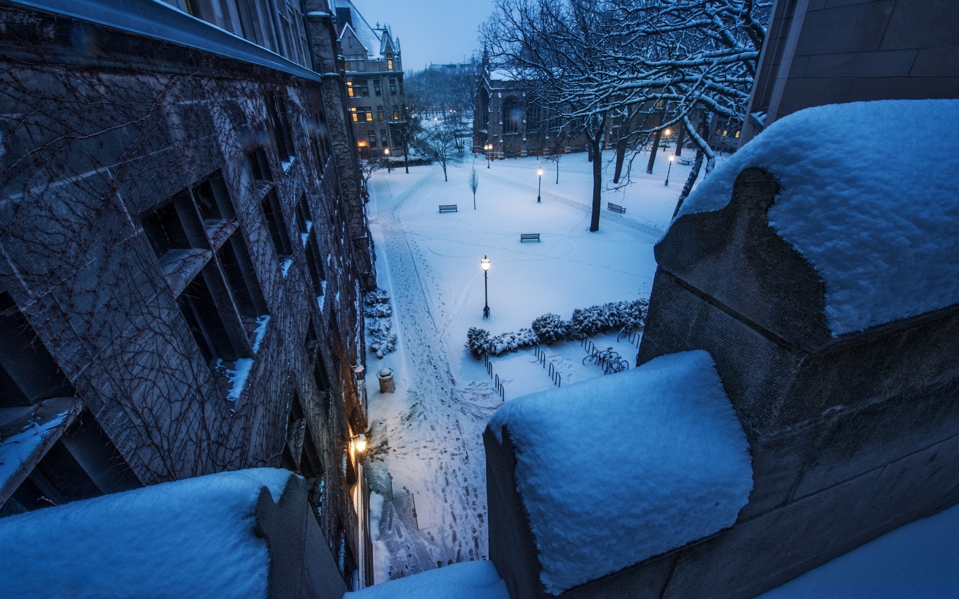 Cortile innevato con lanterne, notte d'inverno in america