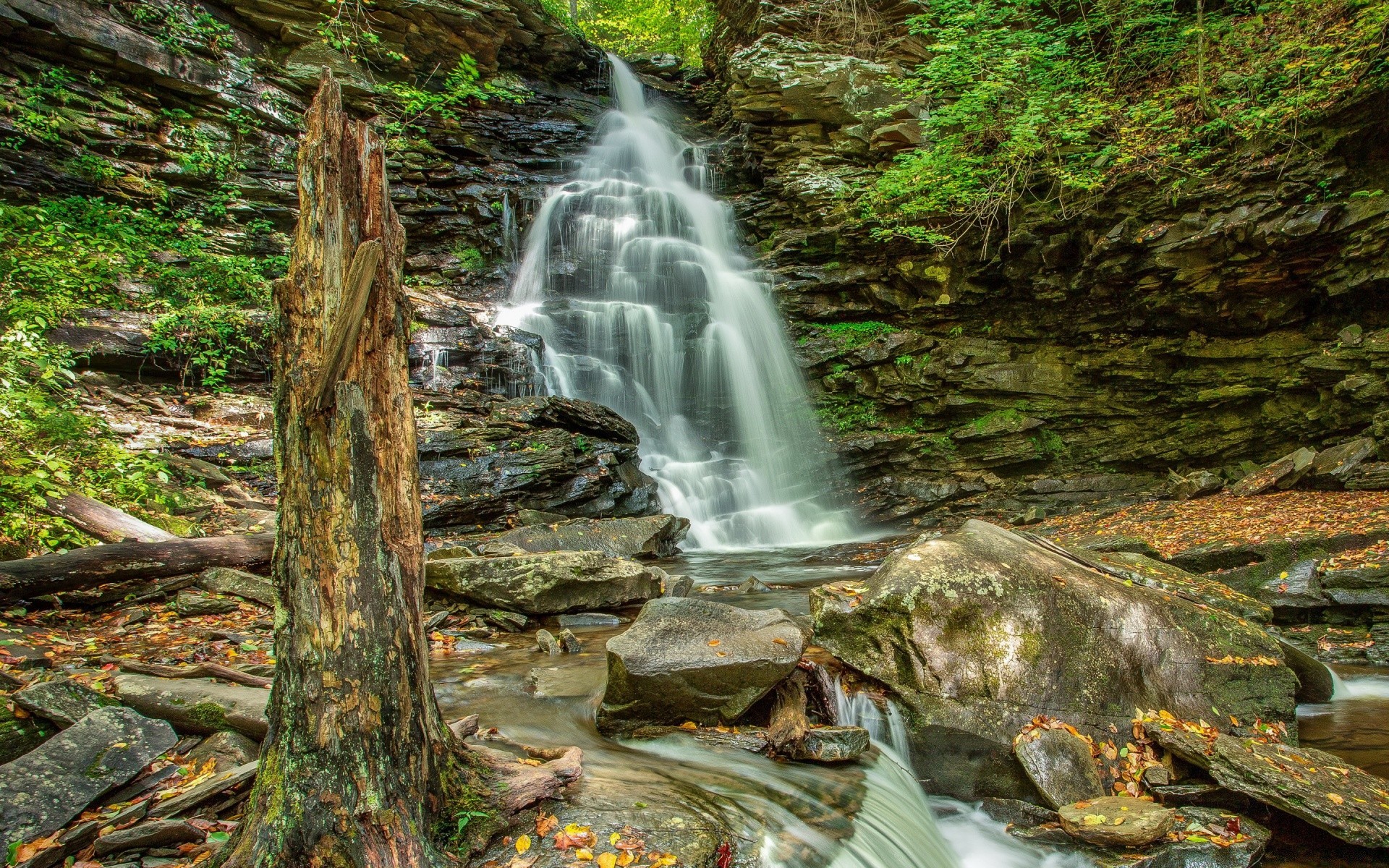 Paesaggio. Cascata. Alberi verdi. Luogo protetto