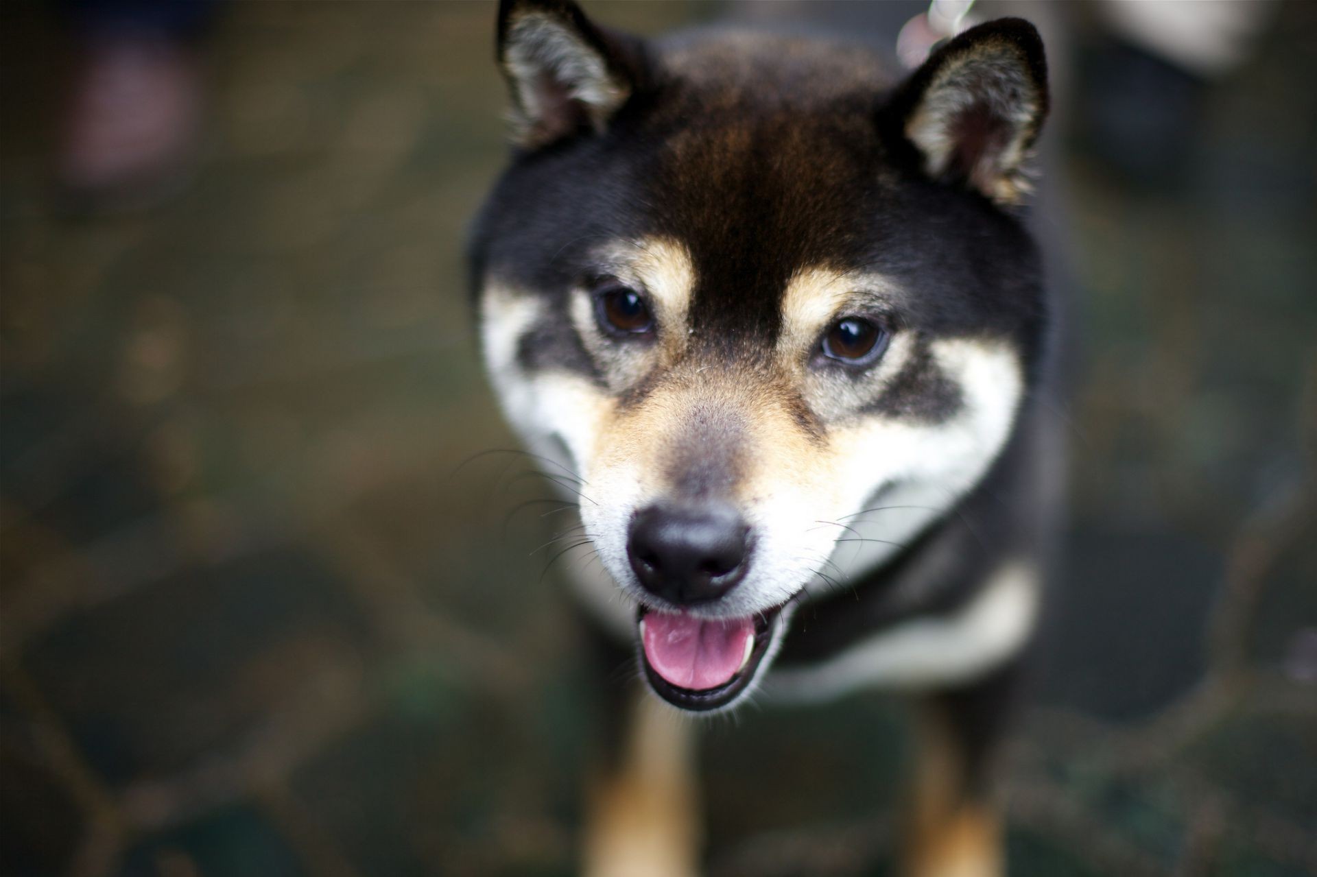 Simpatico cucciolo di colore scuro con macchie chiare sul muso