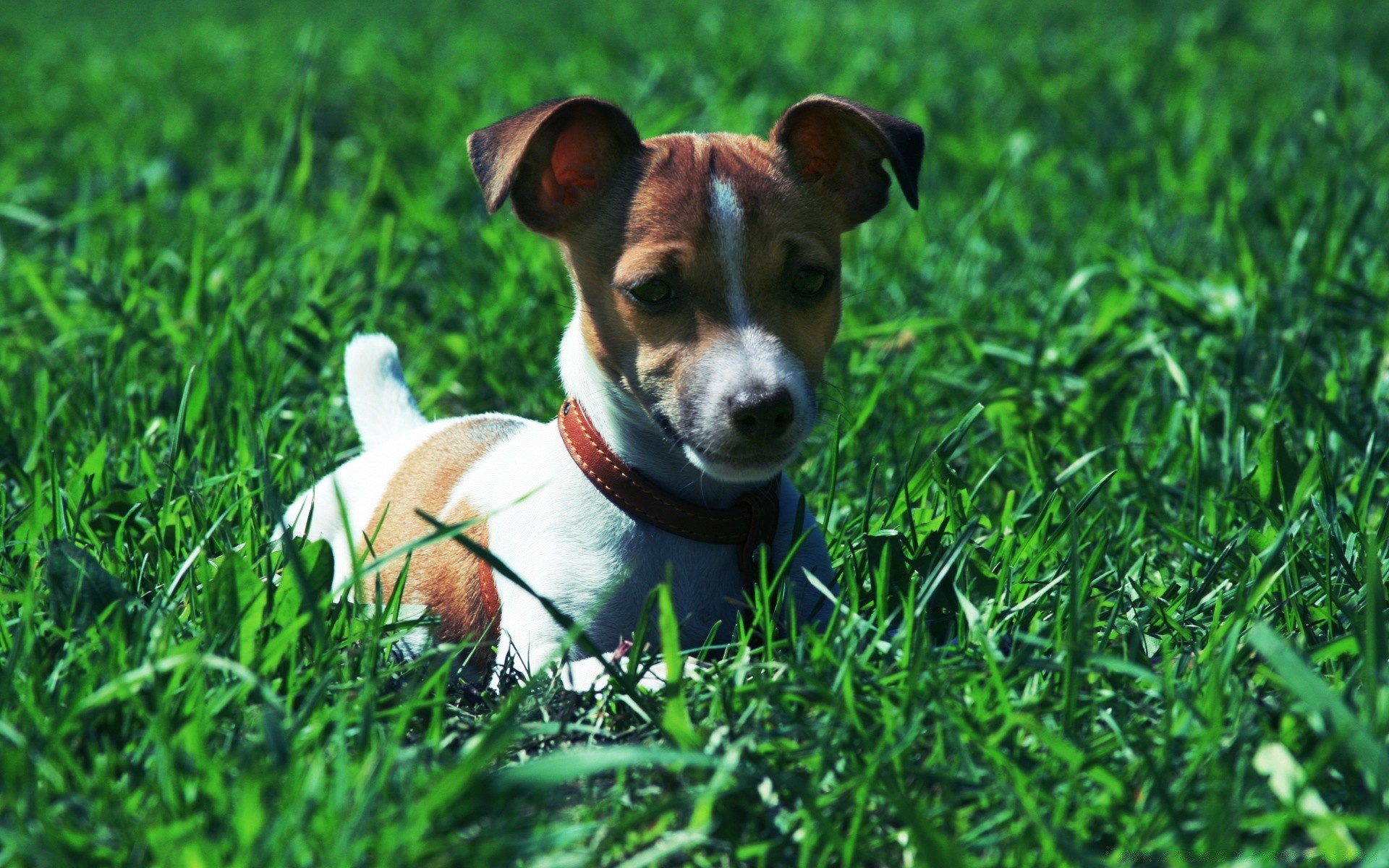 Cucciolo con collare in erba verde