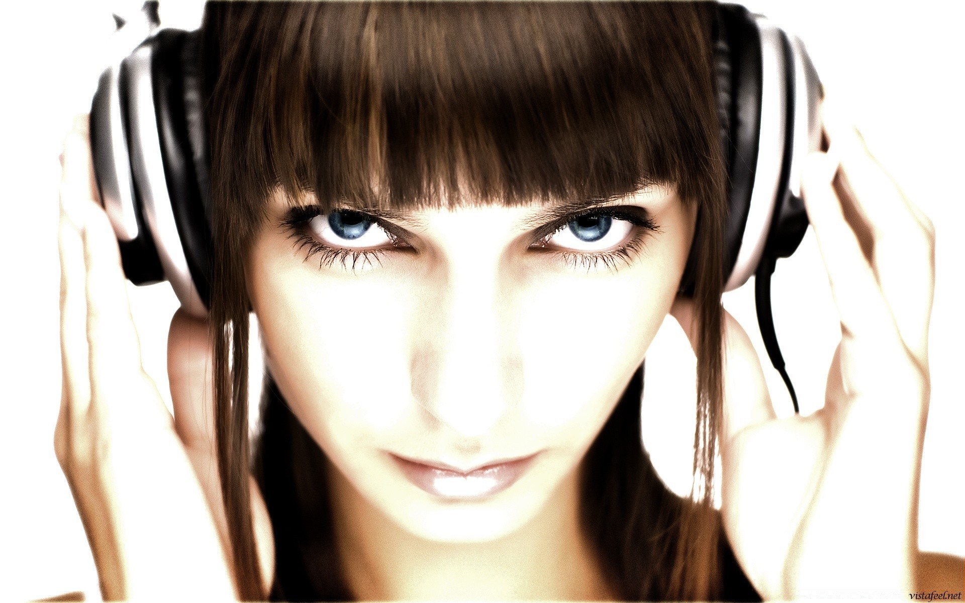 Ragazza con le cuffie con gli occhi rossi