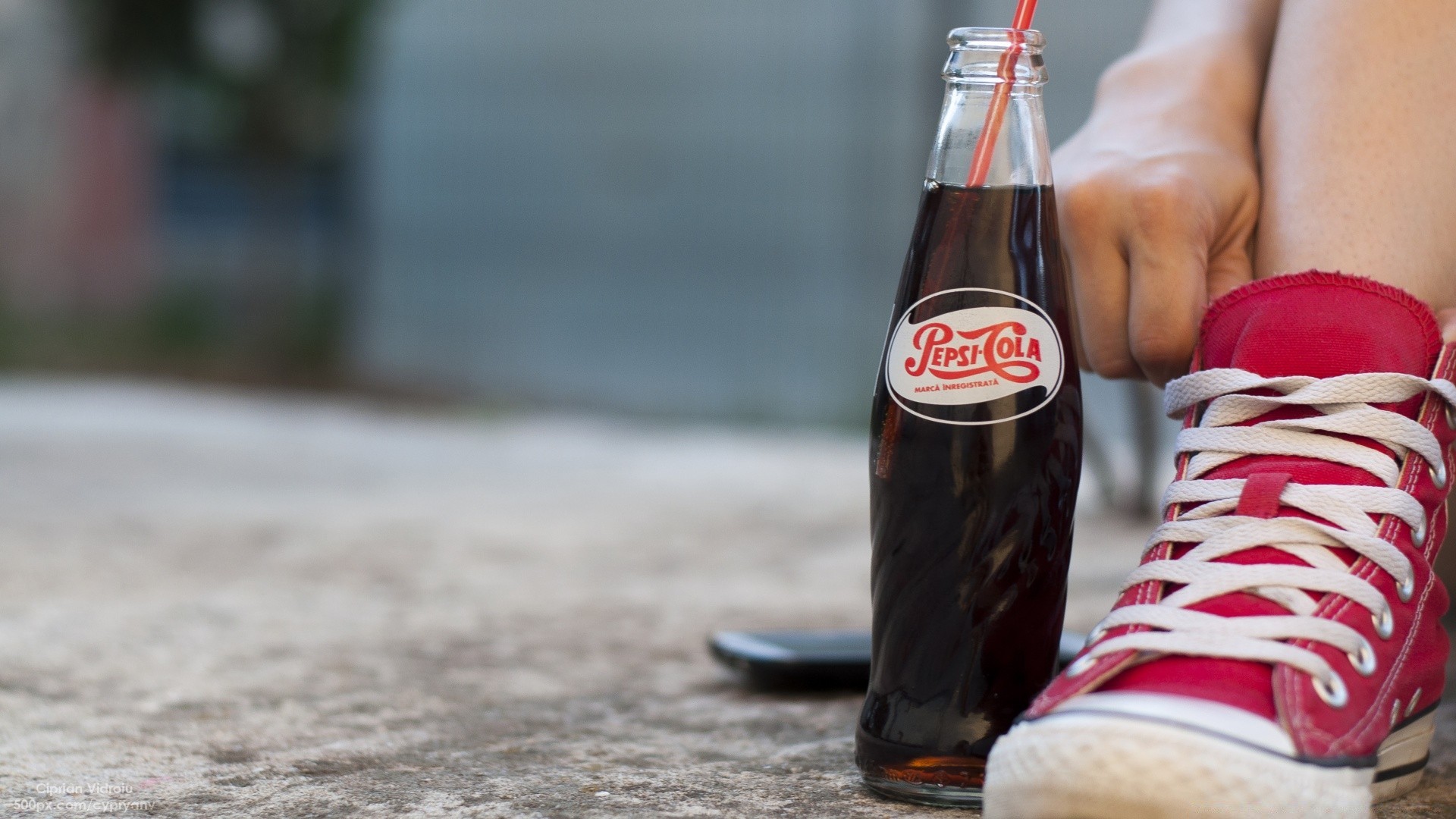 Qualcuno si siede rilassato in scarpe da ginnastica con una bottiglia di pepsi cola sul cemento