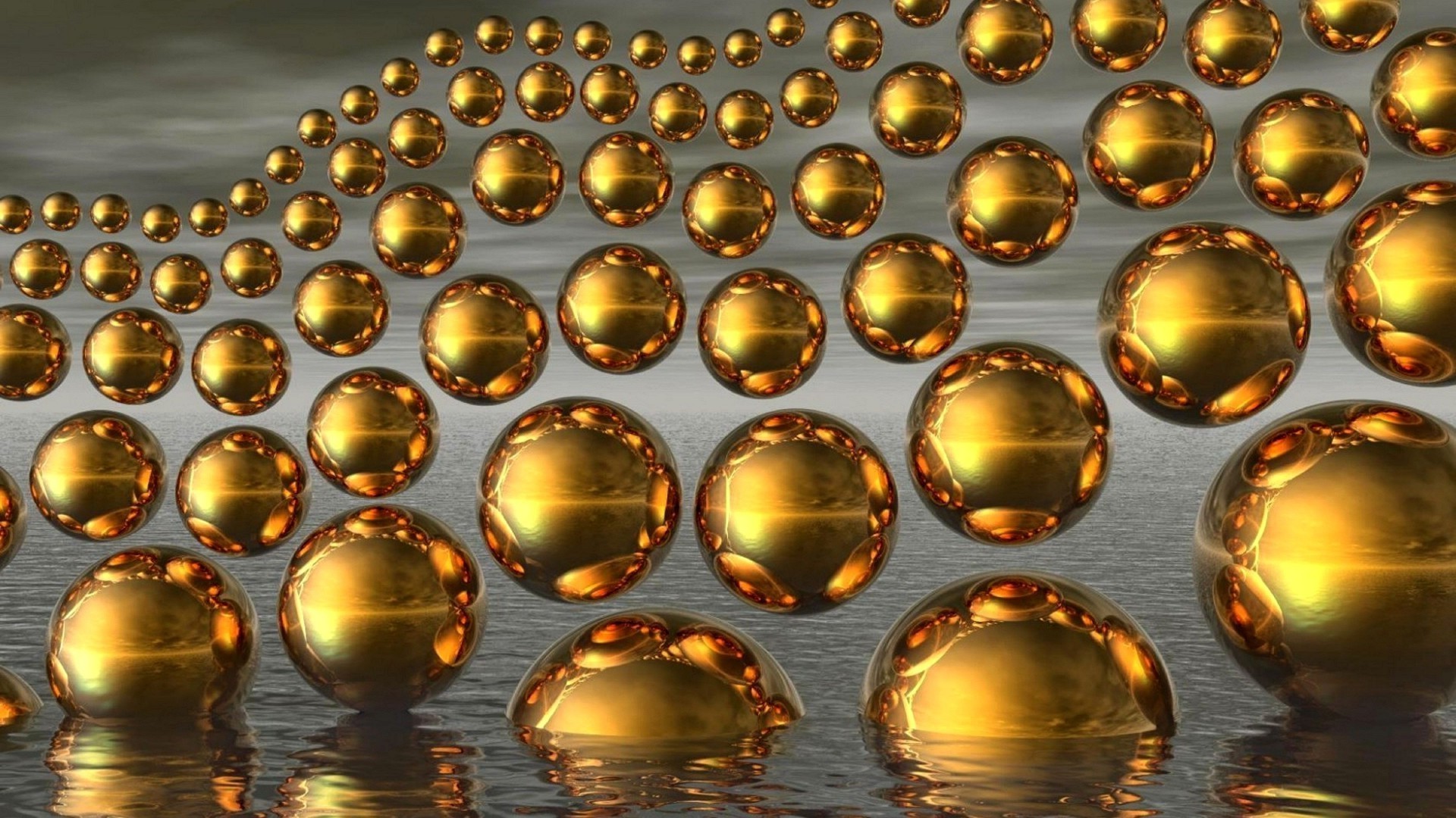 Un numero enorme di palline d'oro parzialmente immerse nell'acquaUn numero enorme di palline d'oro parzialmente immerse nell'acqua