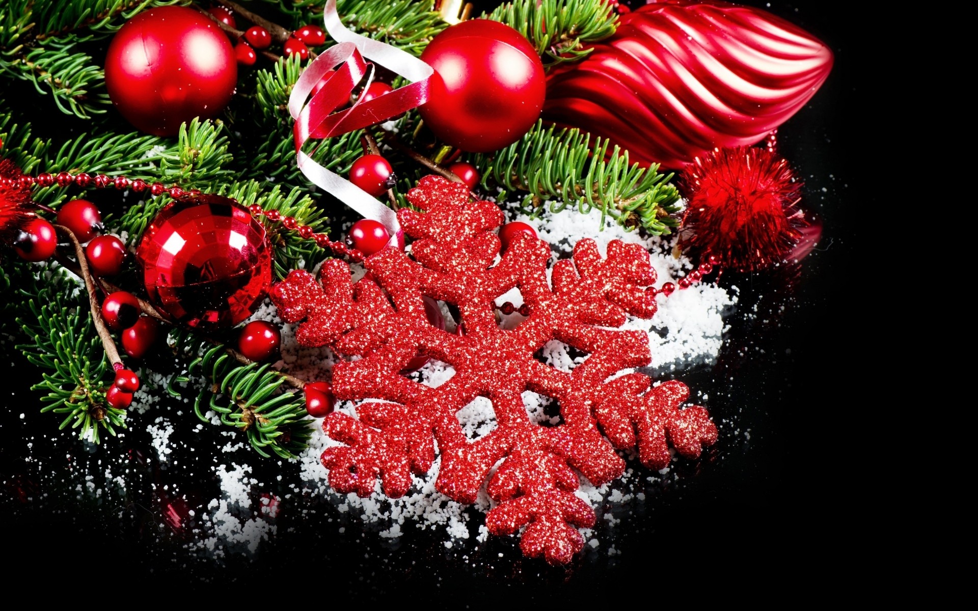 Giocattoli di Natale su un ramo di pino con fiocchi di neve