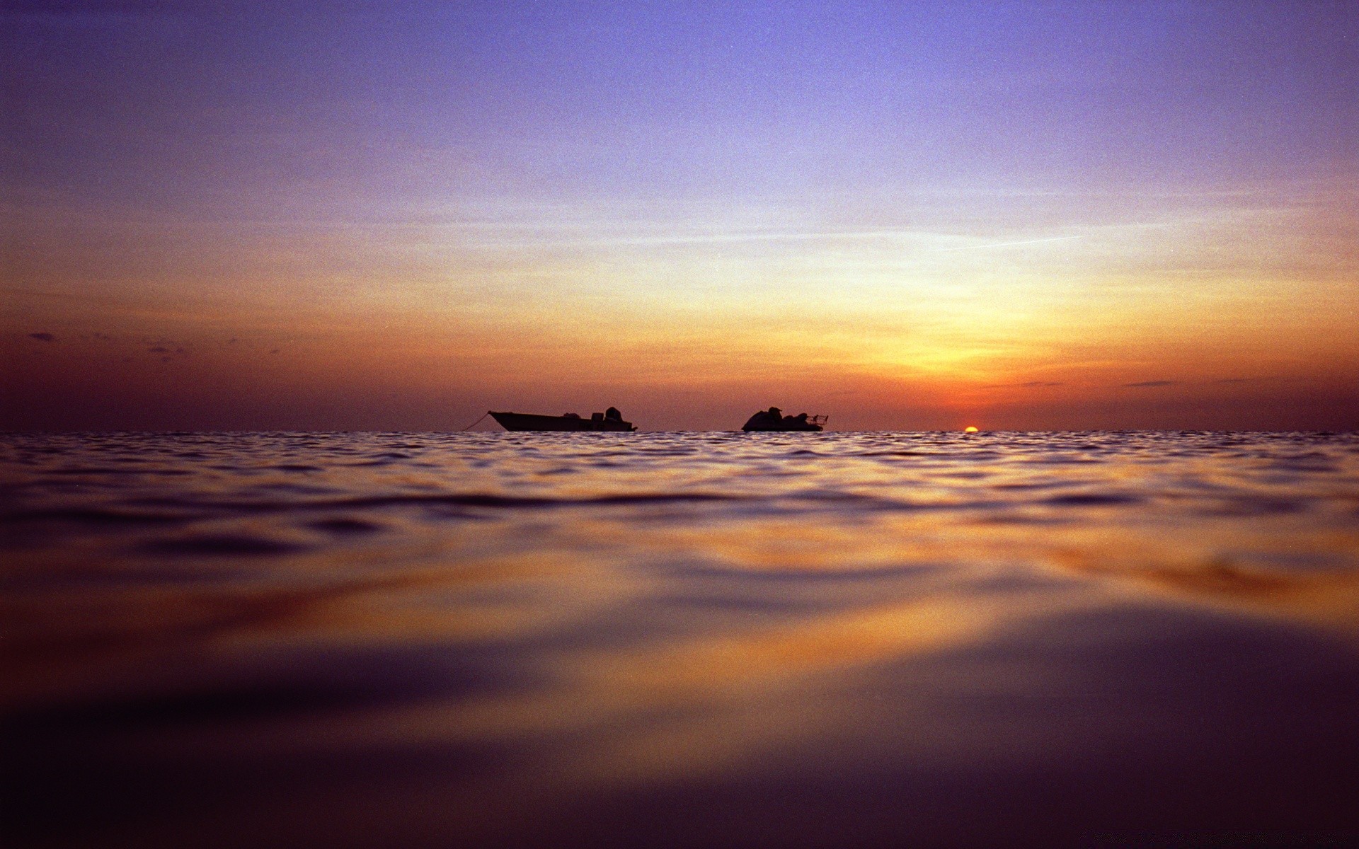 Grandi massi nella sabbia si estendono nell'acqua di mare al tramonto giallo-rossoGrandi massi nella sabbia si estendono nell'acqua di mare al tramonto giallo-rosso